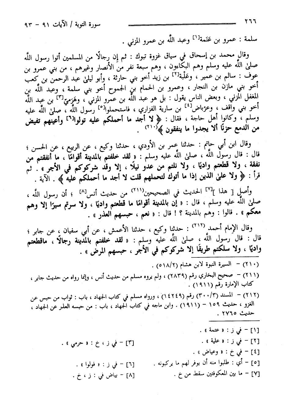 سَلَمَة عَمْرو بْن عُتْبَة وَعَبْد اللَّه بْن عَمْرو الْمُزَنِيّ وَقَالَ مُحَمَّد بْن إِسْحَاق فِي سِيَاق غَزْوَة تَبُوك ثُمَّ إِنَّ رِجَالًا مِنْ الْمُسْلِمِينَ أَتَوْا رَسُول اللَّه صَلَّى اللَّه عَلَيْهِ وَسَلَّمَ وَهُمْ الْبَكَّاءُونَ وَهُمْ سَبْعَة نَفَر مِنْ الْأَنْصَار وَغَيْرهمْ مِنْ بَنِي عَمْرو بْن عَوْف سَالِم بْن عُمَيْر وَعُلَيَّة بْن زَيْد أَخُو بَنِي حَارِثَة وَأَبُو لَيْلَى عَبْد الرَّحْمَن بْن كَعْب أَخُو بَنِي مَازِن بْن النَّجَّار وَعَمْرو بْن الحمام بْن الْجَمُوح أَخُو بَنِي سَلَمَة وَعَبْد اللَّه بْن الْمُغَفَّل الْمُزَنِيّ وَبَعْض النَّاس يَقُول بَلْ هُوَ عَبْد اللَّه بْن عَمْرو الْمُزَنِيّ وَحَرَمِيّ بْن عَبْد اللَّه أَخُو بَنِي وَاقِف وَعِيَاض بْن سَارِيَة الْفَزَارِيّ فَاسْتَحْمَلُوا رَسُول اللَّه صَلَّى اللَّه عَلَيْهِ وَسَلَّمَ وَكَانُوا أَهْل حَاجَة فَقَالَ " لَا أَجِد مَا أَحْمِلكُمْ عَلَيْهِ تَوَلَّوْا وَأَعْيُنهمْ تُفِيض مِنْ الدَّمْع حَزَنًا أَلَّا يَجِدُوا مَا يُنْفِقُونَ " وَقَالَ اِبْن أَبِي حَاتِم حَدَّثَنَا عَمْرو بْن الْأَوْدِيّ حَدَّثَنَا وَكِيع عَنْ الرَّبِيع عَنْ الْحَسَن قَالَ : قَالَ رَسُول اللَّه صَلَّى اللَّه عَلَيْهِ وَسَلَّمَ لَقَدْ خَلَّفْتُمْ بِالْمَدِينَةِ أَقْوَامًا مَا أَنْفَقْتُمْ مِنْ نَفَقَة وَلَا قَطَعْتُمْ وَادِيًا وَلَا نِلْتُمْ مِنْ عَدُوّ نَيْلًا إِلَّا وَقَدْ شَرَكُوكُمْ فِي الْأَجْر .