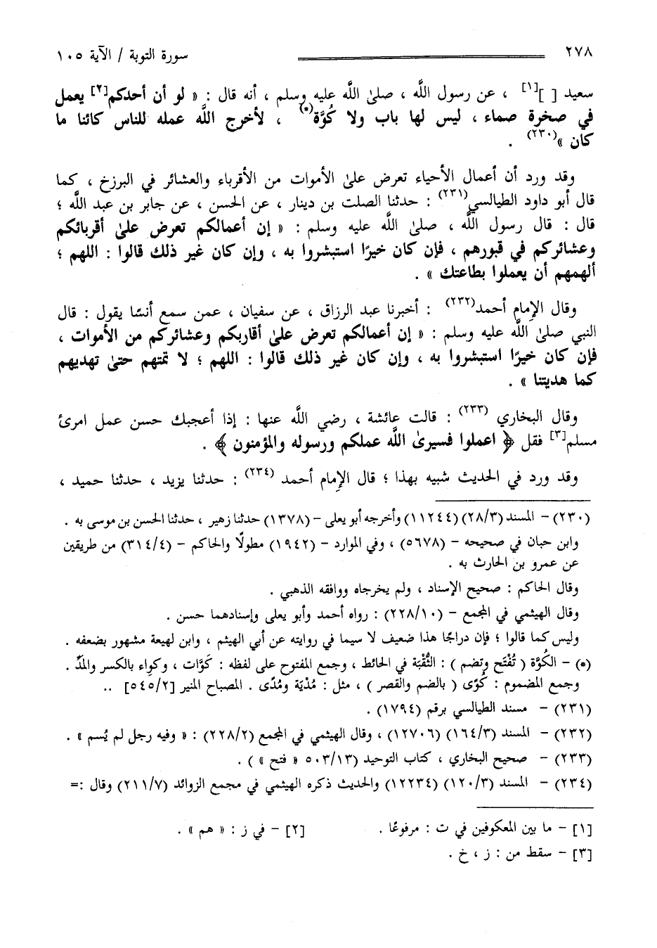سَعِيد مَرْفُوعًا عَنْ رَسُول اللَّه صَلَّى اللَّه عَلَيْهِ وَآله وَسَلَّمَ أَنَّهُ قَالَ " لَوْ أَنَّ أَحَدكُمْ يَعْمَل فِي صَخْرَة صَمَّاء لَيْسَ لَهَا بَاب وَلَا كَوَّة لَأَخْرَجَ اللَّه عَمَله لِلنَّاسِ كَائِنًا مَا كَانَ " وَقَدْ وَرَدَ : إنَّ أَعْمَال الْأَحْيَاء تُعْرَض عَلَى الْأَمْوَات مِنْ الْأَقْرِبَاء وَالْعَشَائِر فِي الْبَرْزَخ كَمَا قَالَ أَبُو دَاوُد الطَّيَالِسِيّ : حَدَّثَنَا الصَّلْت بْن دِينَار عَنْ الْحَسَن عَنْ جَابِر بْن عَبْد اللَّه قَالَ : قَالَ رَسُول اللَّه صَلَّى اللَّه عَلَيْهِ وَآله وَسَلَّمَ " إِنَّ أَعْمَالكُمْ تُعْرَض عَلَى أَقْرِبَائِكُمْ وَعَشَائِركُمْ فِي قُبُورهمْ فَإِنْ كَانَ خَيْرًا اِسْتَبْشَرُوا بِهِ وَإِنْ كَانَ غَيْر ذَلِكَ قَالُوا : اللَّهُمَّ أَلْهِمْهُمْ أَنْ يَعْمَلُوا بِطَاعَتِك " وَقَالَ الْإِمَام أَحْمَد أَنْبَأَنَا عَبْد الرَّزَّاق عَنْ سُفْيَان عَمَّنْ سَمِعَ أَنَسًا يَقُول : قَالَ النَّبِيّ صَلَّى اللَّه عَلَيْهِ وَسَلَّمَ " إِنَّ أَعْمَالكُمْ تُعْرَض عَلَى أَقَارِبكُمْ وَعَشَائِركُمْ مِنْ الْأَمْوَات فَإِنْ كَانَ خَيْرًا اِسْتَبْشَرُوا بِهِ وَإنْ كَانَ غَيْر ذَلِكَ قَالُوا " اللَّهُمَّ لَا تُمِتْهُمْ حَتَّى تَهْدِيهِمْ كَمَا هَدَيْتنَا " وَقَالَ الْبُخَارِيّ : قَالَتْ عَائِشَة رَضِيَ اللَّه عَنْهَا " إِذَا أَعْجَبَك حُسْن عَمَل اِمْرِئٍ مُسْلِم فَقُلْ " اِعْمَلُوا فَسَيَرَى اللَّه عَمَلكُمْ وَرَسُوله وَالْمُؤْمِنُونَ " وَقَدْ وَرَدَ فِي الْحَدِيث شَبِيه بِهَذَا قَالَ الْإِمَام أَحْمَد : حَدَّثَنَا يَزِيد حَدَّثَنَا حُمَيْد