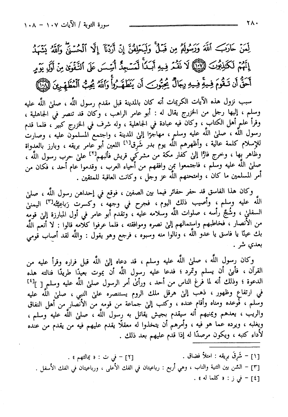 سَبَب نُزُول هَذِهِ الْآيَات الْكَرِيمَات أَنَّهُ كَانَ بِالْمَدِينَةِ قَبْل مَقْدِم رَسُول اللَّه صَلَّى اللَّه عَلَيْهِ وَسَلَّمَ إِلَيْهَا رَجُل مِنْ الْخَزْرَج يُقَال لَهُ أَبُو عَامِر الرَّاهِب وَكَانَ قَدْ تَنَصَّرَ فِي الْجَاهِلِيَّة وَقَرَأَ عِلْم أَهْل الْكِتَاب وَكَانَ فِيهِ عِبَادَة فِي الْجَاهِلِيَّة وَلَهُ شَرَف فِي الْخَزْرَج كَبِير فَلَمَّا قَدِمَ رَسُول اللَّه صَلَّى اللَّه عَلَيْهِ وَسَلَّمَ مُهَاجِرًا إِلَى الْمَدِينَة وَاجْتَمَعَ الْمُسْلِمُونَ عَلَيْهِ وَصَارَتْ لِلْإِسْلَامِ كَلِمَة عَالِيَة وَأَظْهَرَهُمْ اللَّه يَوْم بَدْر شَرِقَ اللَّعِين أَبُو عَامِر بِرِيقِهِ وَبَارَزَ بِالْعَدَاوَةِ وَظَاهَرَ بِهَا وَخَرَجَ فَارًّا إِلَى كُفَّار مَكَّة مِنْ مُشْرِكِي قُرَيْش يُمَالِئهُمْ عَلَى حَرْب رَسُول اللَّه صَلَّى اللَّه عَلَيْهِ وَسَلَّمَ فَاجْتَمَعُوا بِمَنْ وَافَقَهُمْ مِنْ أَحْيَاء الْعَرَب وَقَدِمُوا عَام أُحُد فَكَانَ مِنْ أَمْر الْمُسْلِمِينَ مَا كَانَ وَامْتَحَنَهُمْ اللَّه عَزَّ وَجَلَّ وَكَانَتْ الْعَاقِبَة لِلْمُتَّقِينَ وَكَانَ هَذَا الْفَاسِق قَدْ حَفَرَ حَفَائِر فِيمَا بَيْن الصَّفَّيْنِ فَوَقَعَ فِي إِحْدَاهُنَّ رَسُول اللَّه صَلَّى اللَّه عَلَيْهِ وَسَلَّمَ وَأُصِيبَ ذَلِكَ الْيَوْم فَجُرِحَ وَجْهه وَكُسِرَتْ رَبَاعِيَته الْيُمْنَى السُّفْلَى وَشُجَّ رَأْسُهُ صَلَوَات اللَّه وَسَلَامه عَلَيْهِ وَتَقَدَّمَ أَبُو عَامِر فِي أَوَّل الْمُبَارَزَة إِلَى قَوْمه مِنْ الْأَنْصَار فَخَاطَبَهُمْ وَاسْتَمَالَهُمْ إِلَى نَصْره وَمُوَافَقَته فَلَمَّا عَرَفُوا كَلَامه قَالُوا : لَا أَنْعَمَ اللَّه بِك عَيْنًا يَا فَاسِق يَا عَدُوّ اللَّه وَنَالُوا مِنْهُ وَسَبُّوهُ فَرَجَعَ وَهُوَ يَقُول : وَاَللَّه لَقَدْ أَصَابَ قَوْمِي بَعْدِي شَرّ , وَكَانَ رَسُول اللَّه صَلَّى اللَّه عَلَيْهِ وَسَلَّمَ قَدْ دَعَاهُ إِلَى اللَّه قَبْل فِرَاره وَقَرَأَ عَلَيْهِ مِنْ الْقُرْآن فَأَبَى أَنْ يُسْلِم وَتَمَرَّدَ , فَدَعَا عَلَيْهِ رَسُول اللَّه صَلَّى اللَّه عَلَيْهِ وَسَلَّمَ أَنْ يَمُوت بَعِيدًا طَرِيدًا فَنَالَتْهُ هَذِهِ الدَّعْوَة ; وَذَلِكَ أَنَّهُ لَمَّا فَرَغَ النَّاس مِنْ أُحُد وَرَأَى أَمْر الرَّسُول صَلَّى اللَّه عَلَيْهِ وَسَلَّمَ فِي اِرْتِفَاع وَظُهُور ذَهَبَ إِلَى هِرَقْل مَلِك الرُّوم يَسْتَنْصِرهُ عَلَى النَّبِيّ صَلَّى اللَّه عَلَيْهِ وَسَلَّمَ فَوَعَدَهُ وَمَنَّاهُ وَأَقَامَ عِنْده وَكَتَبَ إِلَى جَمَاعَة مِنْ قَوْمه مِنْ الْأَنْصَار مِنْ أَهْل النِّفَاق وَالرَّيْب يَعِدهُمْ وَيُمَنِّيهِمْ أَنَّهُ سَيَقْدَمُ بِجَيْشٍ يُقَاتِل بِهِ رَسُول اللَّه صَلَّى اللَّه عَلَيْهِ وَسَلَّمَ وَيَغْلِبهُ وَيَرُدّهُ عَمَّا هُوَ فِيهِ , وَأَمَرَهُمْ أَنْ يَتَّخِذُوا لَهُ مَعْقِلًا يَقْدَم عَلَيْهِمْ فِيهِ مَنْ يَقْدَم مِنْ عِنْده لِأَدَاءِ كَتْبه وَيَكُون مَرْصَدًا لَهُ إِذَا قَدِمَ عَلَيْهِمْ بَعْد ذَلِكَ ,