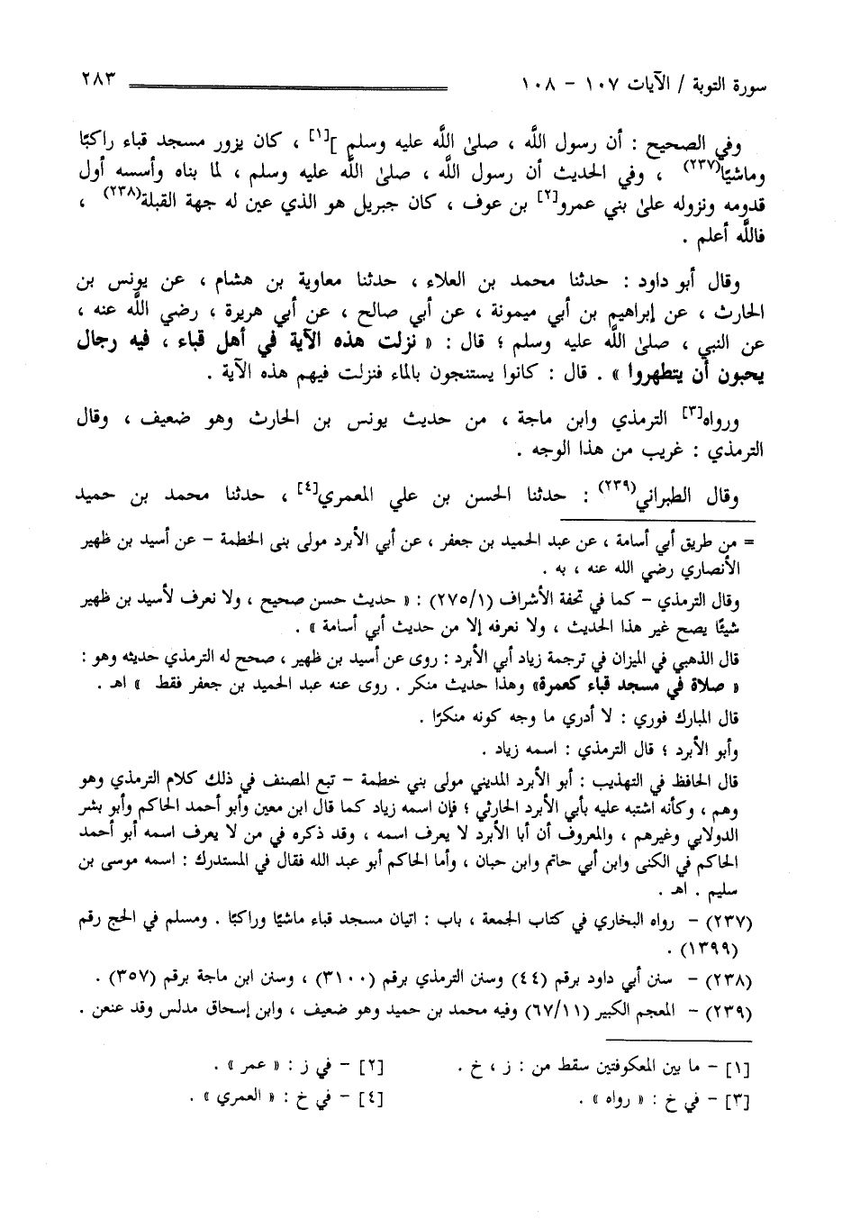 وَقَالَ أَبُو دَاوُد : حَدَّثَنَا مُحَمَّد بْن الْعَلَاء حَدَّثَنَا مُعَاوِيَة بْن هِشَام عَنْ يُونُس بْن الْحَارِث عَنْ إِبْرَاهِيم بْن أَبِي مَيْمُونَة عَنْ أَبِي صَالِح عَنْ أَبِي هُرَيْرَة رَضِيَ اللَّه عَنْهُ عَنْ النَّبِيّ صَلَّى اللَّه عَلَيْهِ وَآله وَسَلَّمَ قَالَ " نَزَلَتْ هَذِهِ الْآيَة فِي أَهْل قُبَاء " فِيهِ رِجَال يُحِبُّونَ أَنْ يَتَطَهَّرُوا " قَالَ كَانُوا يَسْتَنْجُونَ بِالْمَاءِ فَنَزَلَتْ فِيهِمْ هَذِهِ الْآيَة .