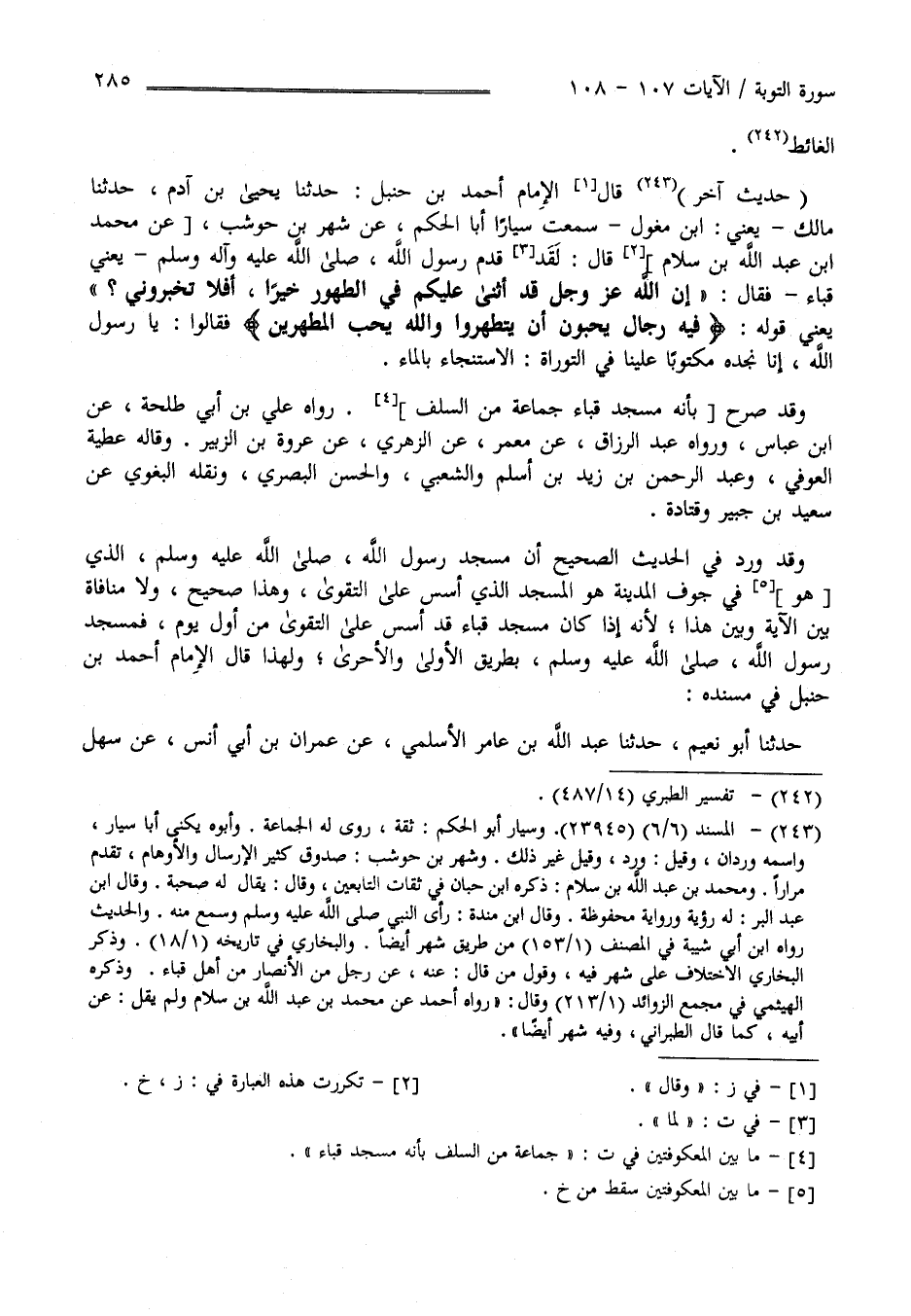 " حَدِيث آخَر " قَالَ الْإِمَام أَحْمَد بْن حَنْبَل : حَدَّثَنَا يَحْيَى بْن آدَم حَدَّثَنَا مَالِك يَعْنِي اِبْن مِغْوَل سَمِعْت سَيَّارًا أَبَا الْحَكَم عَنْ شَهْر بْن حَوْشَب عَنْ مُحَمَّد بْن عَبْد اللَّه بْن سَلَام قَالَ : لَقَدْ قَدِمَ رَسُول اللَّه صَلَّى اللَّه عَلَيْهِ وَآله وَسَلَّمَ يَعْنِي قُبَاء فَقَالَ " إِنَّ اللَّه عَزَّ وَجَلَّ قَدْ أَثْنَى عَلَيْكُمْ فِي الطَّهُور خَيْرًا أَفَلَا تُخْبِرُونِي ؟ " يَعْنِي قَوْله " فِيهِ رِجَال يُحِبُّونَ أَنْ يَتَطَهَّرُوا " فَقَالُوا يَا رَسُول اللَّه إِنَّا نَجِدهُ مَكْتُوبًا عَلَيْنَا فِي التَّوْرَاة الِاسْتِنْجَاء بِالْمَاءِ .