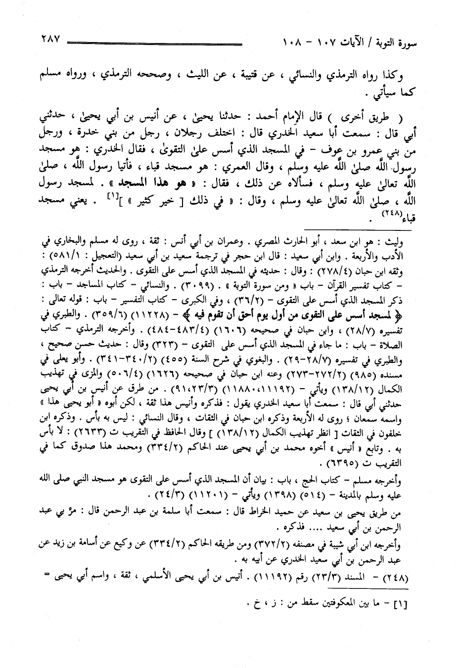 " طَرِيق أُخْرَى " قَالَ الْإِمَام أَحْمَد : حَدَّثَنَا يَحْيَى عَنْ أُنَيْس بْن أَبِي يَحْيَى حَدَّثَنِي أَبِي قَالَ سَمِعْت أَبَا سَعِيد الْخُدْرِيّ قَالَ : اِخْتَلَفَ رَجُلَانِ رَجُل مِنْ بَنِي خُدْرَة وَرَجُل مِنْ بَنِي عَمْرو بْن عَوْف فِي الْمَسْجِد الَّذِي أُسِّسَ عَلَى التَّقْوَى فَقَالَ الْخُدْرِيّ هُوَ مَسْجِد رَسُول اللَّه صَلَّى اللَّه عَلَيْهِ وَسَلَّمَ وَقَالَ الْعُمَرِيّ هُوَ مَسْجِد قُبَاء فَأَتَيَا رَسُول اللَّه صَلَّى اللَّه عَلَيْهِ وَسَلَّمَ فَسَأَلَاهُ عَنْ ذَلِكَ فَقَالَ " هُوَ هَذَا الْمَسْجِد " لِمَسْجِدِ رَسُول اللَّه صَلَّى اللَّه عَلَيْهِ وَسَلَّمَ وَقَالَ فِي ذَلِكَ يَعْنِي مَسْجِد قُبَاء