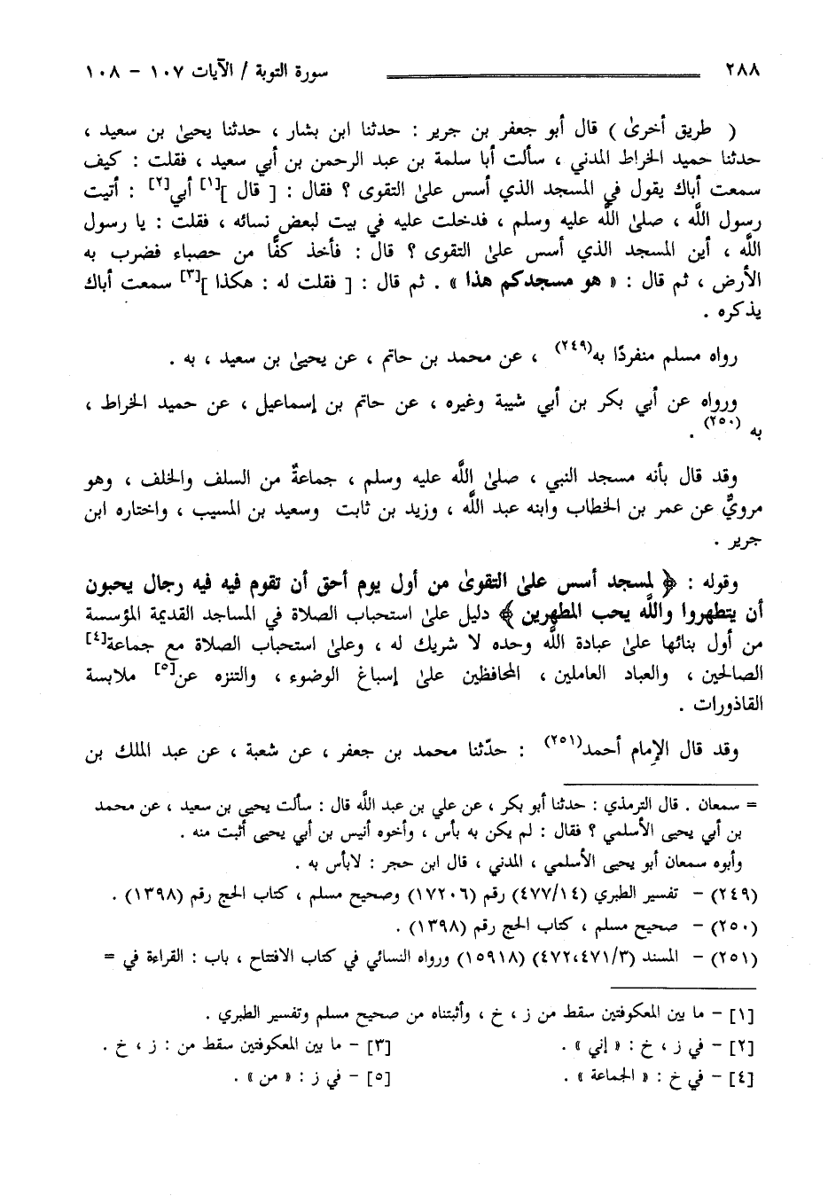 " طَرِيق أُخْرَى " قَالَ الْإِمَام أَحْمَد : حَدَّثَنَا يَحْيَى عَنْ أُنَيْس قَالَ أَبُو جَعْفَر بْن جَرِير : حَدَّثَنَا اِبْن بَشَّار حَدَّثَنَا يَحْيَى بْن سَعِيد حَدَّثَنَا حُمَيْد الْخَرَّاط الْمَدَنِيّ سَأَلْت أَبَا سَلَمَة بْن عَبْد الرَّحْمَن بْن أَبِي سَعِيد فَقُلْت كَيْف سَمِعْت أَبَاك يَقُول فِي الْمَسْجِد الَّذِي أُسِّسَ عَلَى التَّقْوَى ؟ فَقَالَ إِنِّي أَتَيْت رَسُول اللَّه صَلَّى اللَّه عَلَيْهِ وَسَلَّمَ فَدَخَلْت عَلَيْهِ فِي بَيْت لِبَعْضِ نِسَائِهِ فَقُلْت : يَا رَسُول اللَّه أَيْنَ الْمَسْجِد الَّذِي أُسِّسَ عَلَى التَّقْوَى ؟ قَالَ فَأَخَذَ كَفًّا مِنْ حَصْبَاء فَضَرَبَ بِهِ الْأَرْض ثُمَّ قَالَ " هُوَ مَسْجِدكُمْ هَذَا " ثُمَّ قَالَ سَمِعْت أَبَاك يَذْكُرهُ رَوَاهُ مُسْلِم مُنْفَرِدًا بِهِ عَنْ مُحَمَّد بْن حَاتِم عَنْ يَحْيَى بْن سَعِيد بِهِ وَرَوَاهُ عَنْ أَبِي بَكْر بْن أَبِي شَيْبَة وَغَيْره عَنْ حَاتِم بْن إِسْمَاعِيل عَنْ حُمَيْد الْخَرَّاط بِهِ وَقَدْ قَالَ بِأَنَّهُ مَسْجِد النَّبِيّ صَلَّى اللَّه عَلَيْهِ وَسَلَّمَ جَمَاعَة مِنْ السَّلَف وَالْخَلَف وَهُوَ مَرْوِيّ عَنْ عُمَر بْن الْخَطَّاب وَابْنه عَبْد اللَّه وَزَيْد بْن ثَابِت وَسَعِيد بْن الْمُسَيِّب وَاخْتَارَهُ اِبْن جَرِير وَقَوْله " لَمَسْجِد أُسِّسَ عَلَى التَّقْوَى مِنْ أَوَّل يَوْم أَحَقّ أَنْ تَقُوم فِيهِ فِيهِ رِجَال يُحِبُّونَ أَنْ يَتَطَهَّرُوا وَاَللَّه يُحِبّ الْمُطَّهِّرِينَ " دَلِيل عَلَى اِسْتِحْبَاب الصَّلَاة فِي الْمَسَاجِد الْقَدِيمَة الْمُؤَسَّسَة مِنْ أَوَّل بِنَائِهَا عَلَى عِبَادَة اللَّه وَحْده لَا شَرِيك لَهُ وَعَلَى اِسْتِحْبَاب الصَّلَاة مَعَ الْجَمَاعَة الصَّالِحِينَ وَالْعِبَاد الْعَامِلِينَ الْمُحَافِظِينَ عَلَى إِسْبَاغ الْوُضُوء وَالتَّنَزُّه عَنْ مُلَابَسَة الْقَاذُورَات .