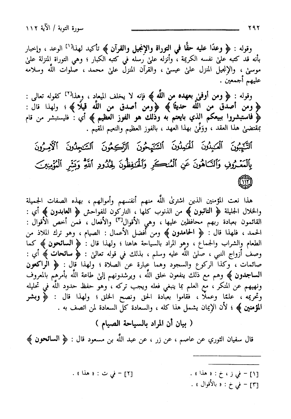 " بَيَان أَنَّ الْمُرَاد بِالسِّيَاحَةِ الصِّيَام " قَالَ سُفْيَان الثَّوْرِيّ عَنْ عَاصِم عَنْ ذَرّ عَنْ عَبْد اللَّه بْن مَسْعُود قَالَ " السَّائِحُونَ