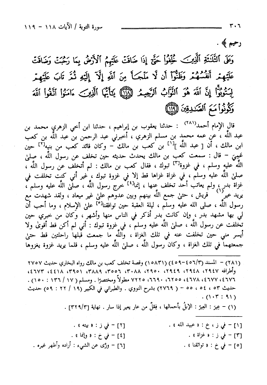 أَصَابَهُمْ فِيهَا جَهْد شَدِيد حَتَّى لَقَدْ ذُكِرَ لَنَا أَنَّ الرَّجُلَيْنِ كَانَا يَشُقَّانِ التَّمْرَة بَيْنهمَا وَكَانَ النَّفَر يَتَدَاوَلُونَ التَّمْرَة بَيْنهمْ يَمُصّهَا هَذَا ثُمَّ يَشْرَب عَلَيْهَا ثُمَّ يَمُصّهَا هَذَا ثُمَّ يَشْرَب عَلَيْهَا فَتَابَ اللَّه عَلَيْهِمْ وَأَقْفَلَهُمْ مِنْ غَزْوَتهمْ , وَقَالَ اِبْن جَرِير حَدَّثَنِي يُونُس بْن عَبْد الْأَعْلَى أَخْبَرَنَا اِبْن وَهْب أَخْبَرَنِي عَمْرو بْن الْحَارِث عَنْ سَعِيد بْن أَبِي هِلَال عَنْ عُتْبَة بْن أَبِي عُتْبَة عَنْ نَافِع بْن جُبَيْر بْن مُطْعِم عَنْ عَبْد اللَّه بْن عَبَّاس أَنَّهُ قِيلَ لِعُمَر بْن الْخَطَّاب فِي شَأْن الْعُسْرَة فَقَالَ عُمَر بْن الْخَطَّاب خَرَجْنَا مَعَ رَسُول اللَّه صَلَّى اللَّه عَلَيْهِ وَسَلَّمَ إِلَى تَبُوك فِي قَيْظ شَدِيد فَنَزَلْنَا مَنْزِلًا فَأَصَابَنَا فِيهِ عَطَش حَتَّى ظَنَنَّا أَنَّ رِقَابنَا سَتَنْقَطِعُ وَحَتَّى إِنْ كَانَ الرَّجُل لَيَذْهَب يَلْتَمِس الْمَاء فَلَا يَرْجِع حَتَّى يَظُنّ أَنَّ رَقَبَته سَتَنْقَطِعُ وَحَتَّى إِنَّ الرَّجُل لِيَنْحَر بَعِيره فَيَعْصِر فَرْثه فَيَشْرَبهُ وَيَجْعَل مَا بَقِيَ عَلَى كَبِده فَقَالَ أَبُو بَكْر الصِّدِّيق يَا رَسُول اللَّه صَلَّى اللَّه عَلَيْهِ وَسَلَّمَ إِنَّ اللَّه عَزَّ وَجَلَّ قَدْ عَوَّدَك فِي الدُّعَاء خَيْرًا فَادْعُ لَنَا فَقَالَ " تُحِبّ ذَلِكَ ؟ " قَالَ نَعَمْ فَرَفَعَ يَدَيْهِ فَلَمْ يُرْجِعهُمَا حَتَّى سَالَتْ السَّمَاء فَأَهْطَلَتْ ثُمَّ سَكَنَتْ فَمَلَئُوا مَا مَعَهُمْ ثُمَّ ذَهَبْنَا نَنْظُر فَلَمْ نَجِدهَا جَاوَزَتْ الْعَسْكَر وَقَالَ اِبْن جَرِير فِي قَوْله " لَقَدْ تَابَ اللَّه عَلَى النَّبِيّ وَالْمُهَاجِرِينَ وَالْأَنْصَار الَّذِينَ اِتَّبَعُوهُ فِي سَاعَة الْعُسْرَة " أَيْ مِنْ النَّفَقَة وَالطُّهْر وَالزَّاد وَالْمَاء " مِنْ بَعْد مَا كَادَ يَزِيغ قُلُوب فَرِيق مِنْهُمْ " أَيْ عَنْ الْحَقّ وَيَشُكّ فِي دِين الرَّسُول صَلَّى اللَّه عَلَيْهِ وَسَلَّمَ وَيَرْتَاب لِلَّذِي نَالَهُمْ مِنْ الْمَشَقَّة وَالشِّدَّة فِي سَفَرهمْ وَغَزْوهمْ " ثُمَّ تَابَ عَلَيْهِمْ " يَقُول ثُمَّ رَزَقَهُمْ الْإِنَابَة " إِلَى رَبّهمْ وَالرُّجُوع إِلَى الثَّبَات عَلَى دِينه " إِنَّهُ بِهِمْ رَءُوف