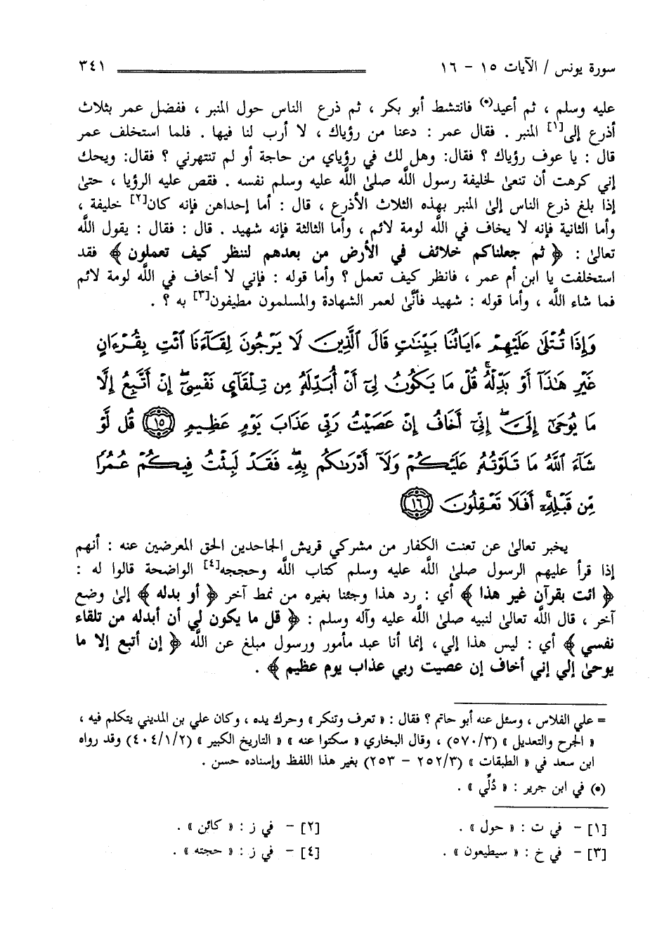 وَإِذَا تُتْلَى عَلَيْهِمْ آَيَاتُنَا بَيِّنَاتٍ قَالَ الَّذِينَ لَا يَرْجُونَ لِقَاءَنَا ائْتِ بِقُرْآَنٍ غَيْرِ هَذَا أَوْ بَدِّلْهُ قُلْ مَا يَكُونُ لِي أَنْ أُبَدِّلَهُ مِنْ تِلْقَاءِ نَفْسِي إِنْ أَتَّبِعُ إِلَّا مَا يُوحَى إِلَيَّ إِنِّي أَخَافُ إِنْ عَصَيْتُ رَبِّي عَذَابَ يَوْمٍ عَظِيمٍ (15)
