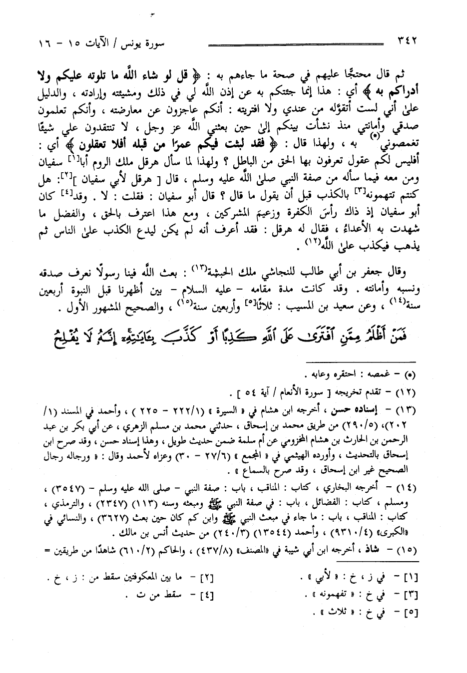 " قُلْ لَوْ شَاءَ اللَّه مَا تَلَوْته عَلَيْكُمْ وَلَا أَدْرَاكُمْ بِهِ " أَيْ هَذَا إِنَّمَا جِئْتُكُمْ بِهِ عَنْ إِذْن اللَّه لِي فِي ذَلِكَ وَمَشِيئَته وَإِرَادَته وَالدَّلِيل عَلَى أَنِّي لَسْت أَتَقَوَّلهُ مِنْ عِنْدِي وَلَا اِفْتَرَيْته أَنَّكُمْ عَاجِزُونَ عَنْ مُعَارَضَته وَأَنَّكُمْ تَعْلَمُونَ صِدْقِي وَأَمَانَتِي مُنْذُ نَشَأْت بَيْنكُمْ إِلَى حِين بَعَثَنِي اللَّه عَزَّ وَجَلَّ لَا تَنْتَقِدُونَ عَلَيَّ شَيْئًا تَغْمِصُونِي بِهِ وَلِهَذَا قَالَ : " فَقَدْ لَبِثْت فِيكُمْ عُمُرًا مِنْ قَبْله أَفَلَا تَعْقِلُونَ " أَيْ أَفَلَيْسَ لَكُمْ عُقُول تَعْرِفُونَ بِهَا الْحَقّ مِنْ الْبَاطِل وَلِهَذَا لَمَّا سَأَلَ هِرَقْل مَلِك الرُّوم أَبَا سُفْيَان وَمَنْ مَعَهُ فِيمَا سَأَلَهُ مِنْ صِفَة النَّبِيّ صَلَّى اللَّه عَلَيْهِ وَسَلَّمَ قَالَ هِرَقْل لِأَبِي سُفْيَان هَلْ كُنْتُمْ تَتَّهِمُونَهُ بِالْكَذِبِ قَبْل أَنْ يَقُول مَا قَالَ ؟ قَالَ أَبُو سُفْيَان فَقُلْت لَا وَكَانَ أَبُو سُفْيَان إِذْ ذَاكَ رَأْس الْكَفَرَة وَزَعِيم الْمُشْرِكِينَ وَمَعَ هَذَا اِعْتَرَفَ بِالْحَقِّ " وَالْفَضْل مَا شَهِدَتْ بِهِ الْأَعْدَاء " فَقَالَ لَهُ هِرَقْل : فَقَدْ أَعْرِف أَنَّهُ لَمْ يَكُنْ لِيَدَع الْكَذِب عَلَى النَّاس ثُمَّ يَذْهَب فَيَكْذِب عَلَى اللَّه وَقَالَ جَعْفَر بْن أَبِي طَالِب لِلنَّجَاشِيِّ مَلِك الْحَبَشَة : بَعَثَ اللَّه فِينَا رَسُولًا نَعْرِف صِدْقه وَنَسَبَهُ وَأَمَانَته وَقَدْ كَانَتْ مُدَّة مُقَامه عَلَيْهِ السَّلَام بَيْن أَظْهُرنَا قَبْل النُّبُوَّة أَرْبَعِينَ سَنَة وَعَنْ سَعِيد بْن الْمُسَيِّب ثَلَاثًا وَأَرْبَعِينَ سَنَة وَالصَّحِيح الْمَشْهُور الْأَوَّل .