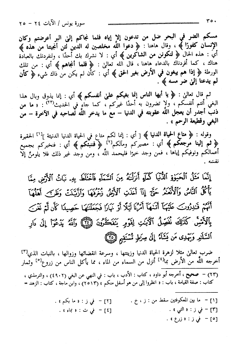 إِنَّمَا مَثَلُ الْحَيَاةِ الدُّنْيَا كَمَاءٍ أَنْزَلْنَاهُ مِنَ السَّمَاءِ فَاخْتَلَطَ بِهِ نَبَاتُ الْأَرْضِ مِمَّا يَأْكُلُ النَّاسُ وَالْأَنْعَامُ حَتَّى إِذَا أَخَذَتِ الْأَرْضُ زُخْرُفَهَا وَازَّيَّنَتْ وَظَنَّ أَهْلُهَا أَنَّهُمْ قَادِرُونَ عَلَيْهَا أَتَاهَا أَمْرُنَا لَيْلًا أَوْ نَهَارًا فَجَعَلْنَاهَا حَصِيدًا كَأَنْ لَمْ تَغْنَ بِالْأَمْسِ كَذَلِكَ نُفَصِّلُ الْآَيَاتِ لِقَوْمٍ يَتَفَكَّرُونَ (24)