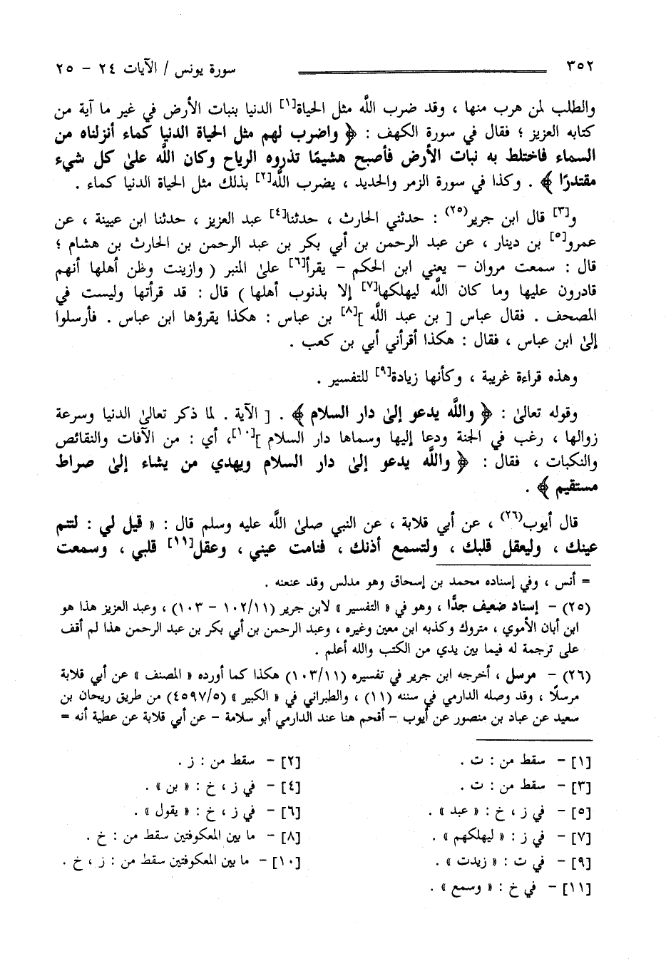 وَقَالَ اِبْن جَرِير : حَدَّثَنِي الْحَارِث حَدَّثَنَا عَبْد الْعَزِيز حَدَّثَنَا اِبْن عُيَيْنَةَ عَنْ عَمْرو بْن دِينَار عَنْ عَبْد الرَّحْمَن بْن أَبِي بَكْر بْن عَبْد الرَّحْمَن بْن الْحَارِث بْن هِشَام قَالَ : سَمِعْت مَرْوَان يَعْنِي اِبْن الْحَكَم يَقْرَأ عَلَى الْمِنْبَر : " وَازَّيَّنَتْ وَظَنَّ أَهْلهَا أَنَّهُمْ قَادِرُونَ عَلَيْهَا وَمَا كَانَ اللَّه لِيُهْلِكهُمْ إِلَّا بِذُنُوبِ أَهْلهَا " قَالَ : قَدْ قَرَأَتْهَا وَلَيْسَتْ فِي الْمُصْحَف فَقَالَ عَبَّاس بْن عَبْد اللَّه بْن عَبَّاس : هَكَذَا يَقْرَؤُهَا اِبْن عَبَّاس فَأَرْسَلُوا إِلَى اِبْن عَبَّاس فَقَالَ : هَكَذَا أَقْرَأَنِي أُبَيّ بْن كَعْب وَهَذِهِ قِرَاءَة غَرِيبَة وَكَأَنَّهَا زِيدَتْ لِلتَّفْسِيرِ .