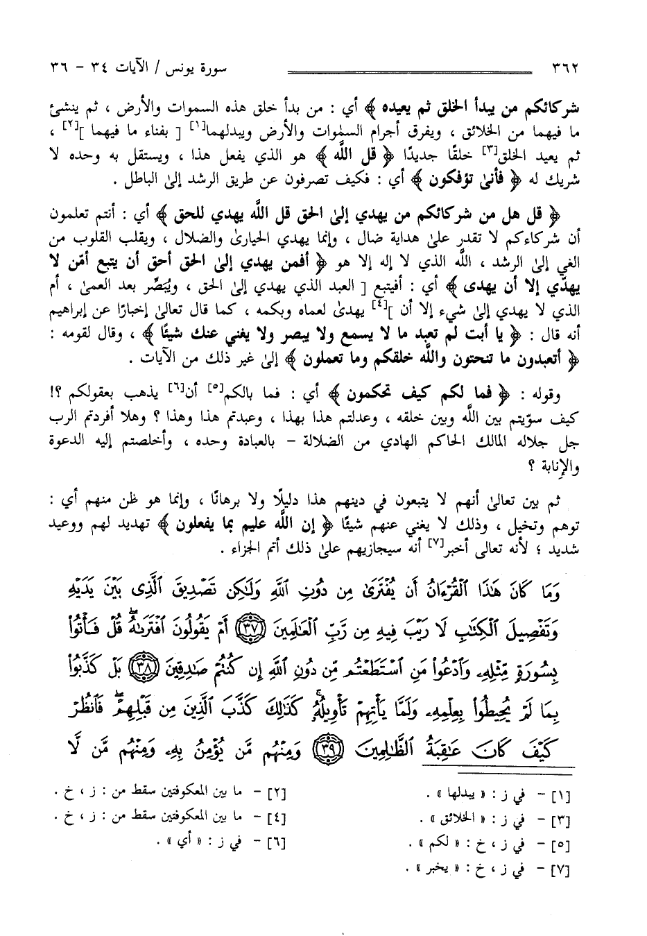 شُرَكَائِكُمْ مَنْ يَبْدَأ الْخَلْق ثُمَّ يُعِيدهُ " أَيْ مَنْ بَدَأَ خَلْق هَذِهِ السَّمَوَات وَالْأَرْض ثُمَّ يُنْشِئ مَا فِيهِمَا مِنْ الْخَلَائِق وَيُفَرِّق أَجْرَام السَّمَوَات وَالْأَرْض وَيُبْدِلهُمَا بِفَنَاءِ مَا فِيهِمَا ثُمَّ يُعِيد الْخَلْق خَلْقًا جَدِيدًا " قُلْ اللَّه " هُوَ الَّذِي يَفْعَل هَذَا وَيَسْتَقِلّ بِهِ وَحْده لَا شَرِيك لَهُ " فَأَنَّى تُؤْفَكُونَ " أَيْ فَكَيْف تُصْرَفُونَ عَنْ طَرِيق الرُّشْد إِلَى الْبَاطِل .