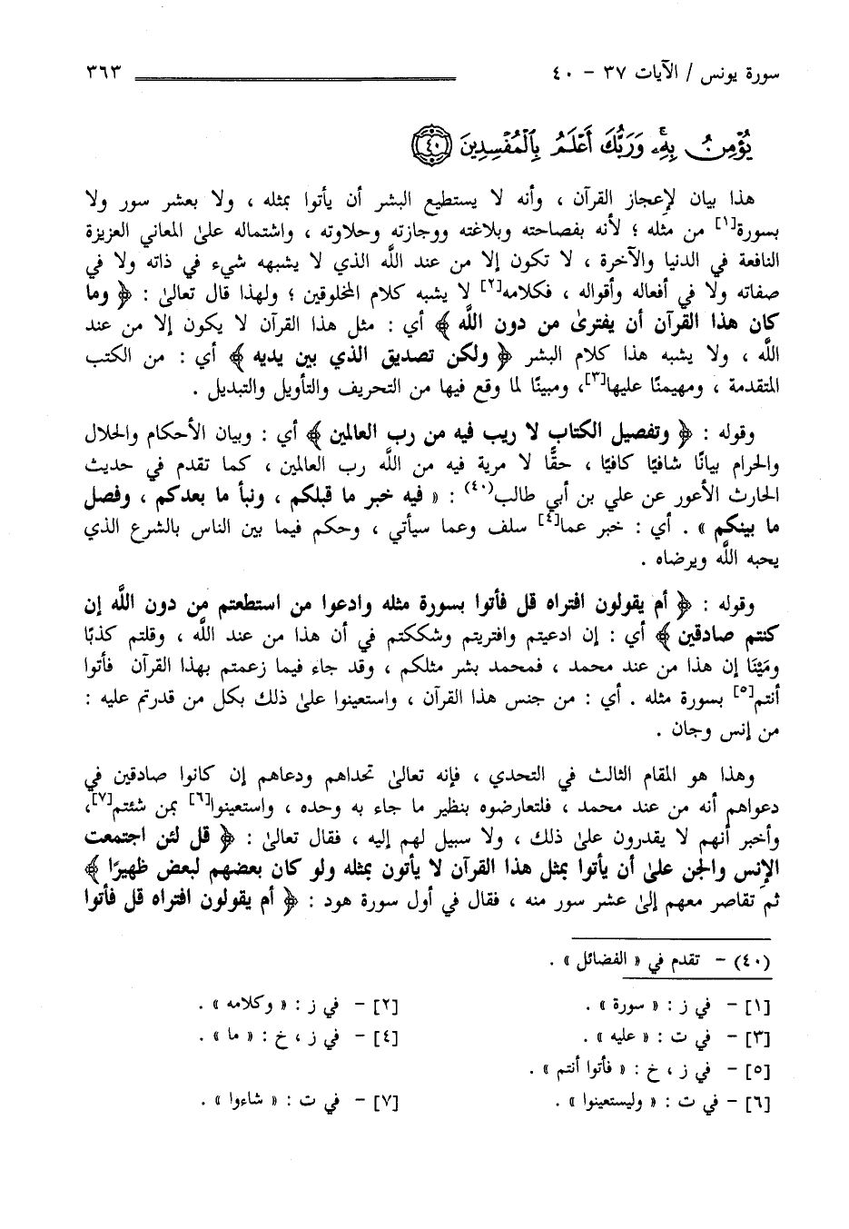 وَقَوْله " أَمْ يَقُولُونَ اِفْتَرَاهُ قُلْ فَأْتُوا بِسُورَةٍ مِثْله وَادْعُوا مَنْ اِسْتَطَعْتُمْ مِنْ دُون اللَّه إِنْ كُنْتُمْ صَادِقِينَ " أَيْ إِنْ اِدَّعَيْتُمْ وَافْتَرَيْتُمْ وَشَكَكْتُمْ فِي أَنَّ هَذَا مِنْ عِنْد اللَّه وَقُلْتُمْ كَذِبًا مُبِينًا إِنَّ هَذَا مِنْ عِنْد مُحَمَّد فَمُحَمَّد بَشَر مِثْلكُمْ وَقَدْ جَاءَ فِيمَا زَعَمْتُمْ بِهَذَا الْقُرْآن فَأْتُوا أَنْتُمْ بِسُورَةٍ مِثْله أَيْ مِنْ جِنْس هَذَا الْقُرْآن وَاسْتَعِينُوا عَلَى ذَلِكَ بِكُلِّ مَنْ قَدَرْتُمْ عَلَيْهِ مِنْ إِنْس وَجَانّ ; وَهَذَا هُوَ الْمَقَام الثَّالِث فِي التَّحَدِّي فَإِنَّهُ تَعَالَى تَحَدَّاهُمْ وَدَعَاهُمْ إِنْ كَانُوا صَادِقِينَ فِي دَعْوَاهُمْ أَنَّهُ مِنْ عِنْد مُحَمَّد فَلْيُعَارِضُوهُ بِنَظِيرِ مَا جَاءَ بِهِ وَحْده وَلْيَسْتَعِينُوا بِمَنْ شَاءُوا وَأَخْبَرَ أَنَّهُمْ لَا يَقْدِرُونَ عَلَى ذَلِكَ وَلَا سَبِيل لَهُمْ إِلَيْهِ فَقَالَ تَعَالَى " قُلْ لَئِنْ اِجْتَمَعَتْ الْإِنْس وَالْجِنّ عَلَى أَنْ يَأْتُوا بِمِثْلِ هَذَا الْقُرْآن لَا يَأْتُونَ بِمِثْلِهِ وَلَوْ كَانَ بَعْضهمْ لِبَعْضٍ ظَهِيرًا " ثُمَّ تَقَاصَرَ مَعَهُمْ إِلَى عَشْر سُوَر مِنْهُ فَقَالَ فِي أَوَّل سُورَة هُود " أَمْ يَقُولُونَ اِفْتَرَاهُ قُلْ فَأْتُوا