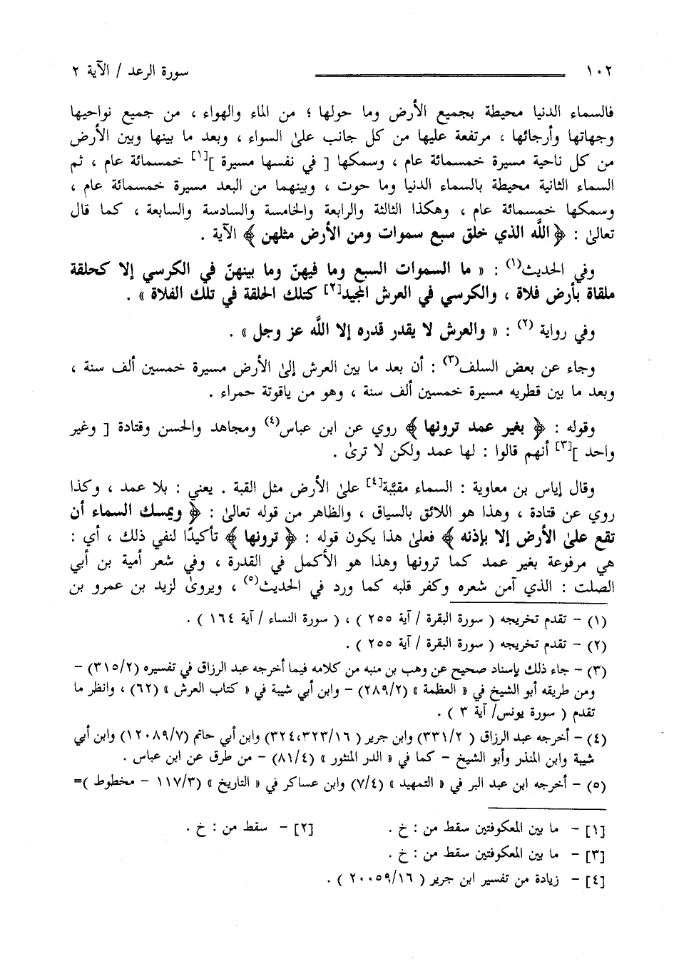 وَهَكَذَا الثَّالِثَة وَالرَّابِعَة وَالْخَامِسَة وَالسَّادِسَة وَالسَّابِعَة كَمَا قَالَ تَعَالَى " اللَّه الَّذِي خَلَقَ سَبْع سَمَوَات وَمِنْ الْأَرْض مِثْلهنَّ " الْآيَة وَفِي الْحَدِيث " مَا السَّمَوَات السَّبْع وَمَا فِيهِنَّ وَمَا بَيْنهنَّ فِي الْكُرْسِيّ إِلَّا كَحَلْقَةٍ مُلْقَاة بِأَرْضٍ فَلَاة وَالْكُرْسِيّ فِي الْعَرْش الْمَجِيد كَتِلْكَ الْحَلْقَة فِي تِلْكَ الْفَلَاة " وَفِي رِوَايَة " وَالْعَرْش لَا يُقَدِّر قَدْره إِلَّا اللَّه عَزَّ وَجَلَّ " وَجَاءَ عَنْ بَعْض السَّلَف أَنَّ بُعْد مَا بَيْن الْعَرْش إِلَى الْأَرْض مَسِيرَة خَمْسِينَ أَلْف سَنَة وَبُعْد مَا بَيْن قُطْرَيْهِ مَسِيرَة خَمْسِينَ أَلْف سَنَة وَهُوَ مِنْ يَاقُوتَة حَمْرَاء وَقَوْله " بِغَيْرِ عَمَد تَرَوْنَهَا " رُوِيَ عَنْ اِبْن عَبَّاس وَمُجَاهِد وَالْحَسَن وَقَتَادَة وَغَيْر وَاحِد أَنَّهُمْ قَالُوا لَهَا عَمَد وَلَكِنْ لَا تُرَى وَقَالَ إِيَاس بْن مُعَاوِيَة السَّمَاء عَلَى الْأَرْض مِثْل الْقُبَّة يَعْنِي بِلَا عَمَد وَكَذَا رُوِيَ عَنْ قَتَادَة وَهَذَا هُوَ اللَّائِق بِالسِّيَاقِ وَالظَّاهِر مِنْ قَوْله تَعَالَى " وَيُمْسِك السَّمَاء أَنْ تَقَع عَلَى الْأَرْض إِلَّا بِإِذْنِهِ " فَعَلَى هَذَا يَكُون قَوْله " تَرَوْنَهَا " تَأْكِيدًا لِنَفْيِ ذَلِكَ أَيْ هِيَ مَرْفُوعَة بِغَيْرِ عَمَد كَمَا تَرَوْنَهَا وَهَذَا هُوَ الْأَكْمَل فِي الْقُدْرَة وَفِي شِعْر أُمَيَّة بْن أَبِي الصَّلْت آمَنَ شِعْره وَكَفَرَ قَلْبه كَمَا وَرَدَ فِي الْحَدِيث وَيُرْوَى لِزَيْدِ بْن عَمْرو بْن
