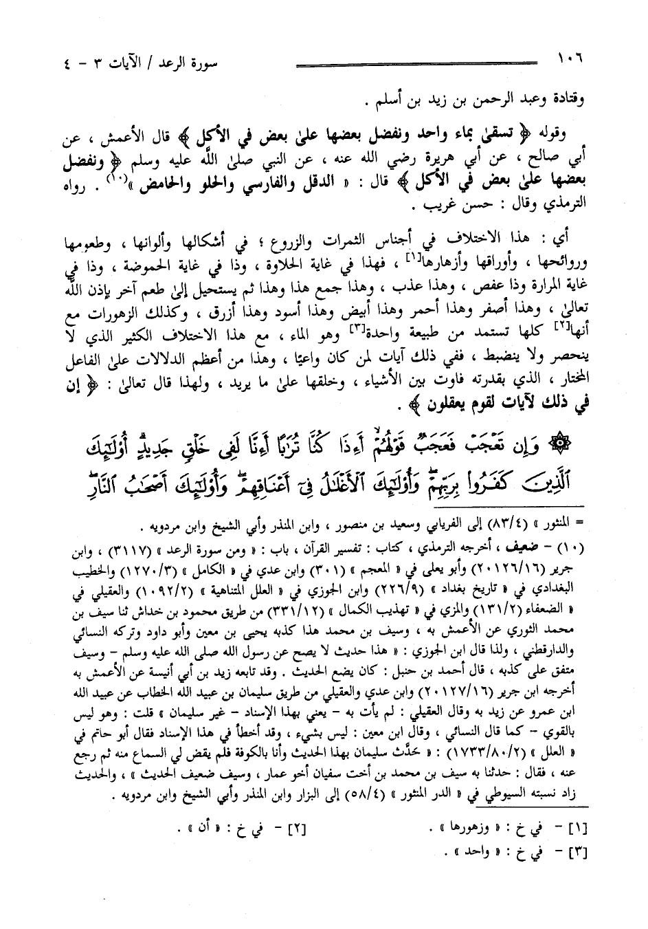 وَقَتَادَة وَعَبْد الرَّحْمَن بْن زَيْد بْن أَسْلَم وَغَيْر وَاحِد وَقَوْله " تُسْقَى بِمَاءٍ وَاحِد وَنُفَضِّل بَعْضهَا عَلَى بَعْض فِي الْأُكُل " قَالَ الْأَعْمَش عَنْ أَبِي صَالِح عَنْ أَبِي هُرَيْرَة عَنْ النَّبِيّ صَلَّى اللَّه عَلَيْهِ وَسَلَّمَ " وَنُفَضِّل بَعْضهَا عَلَى بَعْض فِي الْأُكُل" قَالَ " الدَّقَل وَالْفَارِسِيّ وَالْحُلْو وَالْحَامِض " رَوَاهُ التِّرْمِذِيّ وَقَالَ حَسَن غَرِيب أَيْ هَذَا الِاخْتِلَاف فِي أَجْنَاس الثَّمَرَات وَالزُّرُوع فِي أَشْكَالهَا وَأَلْوَانهَا وَطُعُومهَا وَرَوَائِحهَا وَأَوْرَاقهَا وَأَزْهَارهَا فَهَذَا فِي غَايَة الْحَلَاوَة وَهَذَا فِي غَايَة الْحُمُوضَة وَذَا فِي غَايَة الْمَرَارَة وَذَا عَفْص وَهَذَا عَذْب وَهَذَا جَمْع وَهَذَا وَهَذَا ثُمَّ يَسْتَحِيل إِلَى طَعْم آخَر بِإِذْنِ اللَّه تَعَالَى وَهَذَا أَصْفَر وَهَذَا أَحْمَر وَهَذَا أَبْيَض وَهَذَا أَسْوَد وَهَذَا أَزْرَق وَكَذَلِكَ الزُّهُورَات مَعَ أَنَّهَا كُلّهَا تَسْتَمِدّ مِنْ طَبِيعَة وَاحِدَة وَهُوَ الْمَاء مَعَ هَذَا الِاخْتِلَاف الْكَبِير الَّذِي لَا يَنْحَصِر وَلَا يَنْضَبِط فَفِي ذَلِكَ آيَات لِمَنْ كَانَ وَاعِيًا وَهَذَا مِنْ أَعْظَم الدَّلَالَات عَلَى الْفَاعِل الْمُخْتَار الَّذِي بِقُدْرَتِهِ فَاوَتَ بَيْن الْأَشْيَاء وَخَلَقَهَا عَلَى مَا يُرِيد وَلِهَذَا قَالَ تَعَالَى " إِنَّ فِي ذَلِكَ لَآيَاتٍ لِقَوْمٍ يَعْقِلُونَ " .