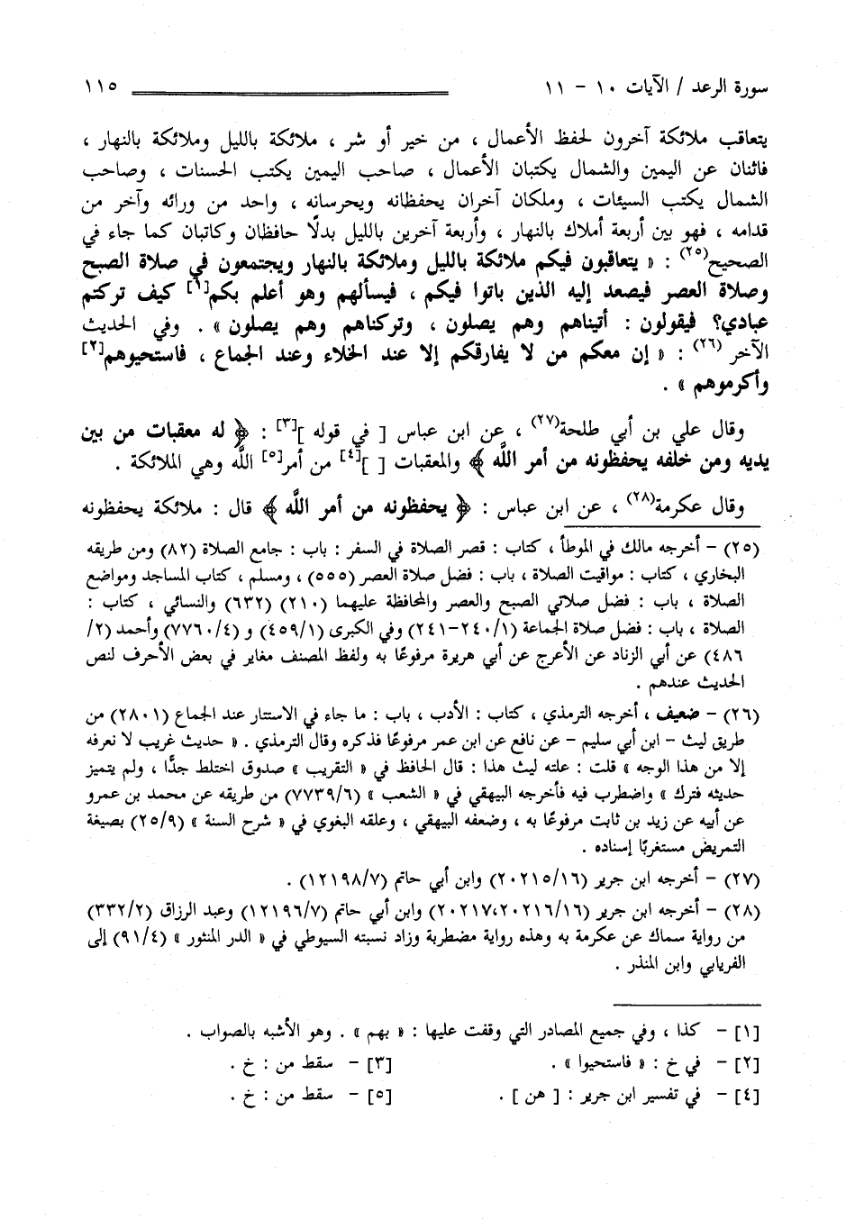 يَتَعَاقَب مَلَائِكَة آخَرُونَ لِحِفْظِ الْأَعْمَال مِنْ خَيْر أَوْ شَرّ مَلَائِكَة بِاللَّيْلِ وَمَلَائِكَة بِالنَّهَارِ فَاثْنَانِ عَنْ الْيَمِين وَالشِّمَال يَكْتُبَانِ الْأَعْمَال صَاحِب الْيَمِين يَكْتُب الْحَسَنَات وَصَاحِب الشِّمَال يَكْتُب السَّيِّئَات وَمَلَكَانِ آخَرَانِ يَحْفَظَانِهِ وَيَحْرُسَانِهِ وَاحِد مِنْ وَرَائِهِ وَآخَر مِنْ قُدَّامه فَهُوَ بَيْن أَرْبَعَة أَمْلَاك بِالنَّهَارِ وَأَرْبَعَة آخَرِينَ بِاللَّيْلِ بَدَلًا حَافِظَانِ وَكَاتِبَانِ كَمَا جَاءَ فِي الصَّحِيح " يَتَعَاقَبُونَ فِيكُمْ مَلَائِكَة بِاللَّيْلِ وَمَلَائِكَة بِالنَّهَارِ وَيَجْتَمِعُونَ فِي صَلَاة الصُّبْح وَصَلَاة الْعَصْر فَيَصْعَد إِلَيْهِ الَّذِينَ بَاتُوا فِيكُمْ فَيَسْأَلهُمْ وَهُوَ أَعْلَم بِكُمْ كَيْفَ تَرَكْتُمْ عِبَادِي ؟ فَيَقُولُونَ أَتَيْنَاهُمْ وَهُمْ يُصَلُّونَ وَتَرَكْنَاهُمْ وَهُمْ يُصَلُّونَ " وَفِي الْحَدِيث الْآخَر " إِنَّ مَعَكُمْ مَنْ لَا يُفَارِقكُمْ إِلَّا عِنْد الْخَلَاء وَعِنْد الْجِمَاع فَاسْتَحْيُوهُمْ وَأَكْرِمُوهُمْ " وَقَالَ عَلِيّ بْن أَبِي طَلْحَة عَنْ اِبْن عَبَّاس فِي قَوْله " لَهُ مُعَقِّبَات مِنْ بَيْن يَدَيْهِ وَمِنْ خَلْفه يَحْفَظُونَهُ مِنْ أَمْر اللَّه" وَالْمُعَقِّبَات مِنْ اللَّه هِيَ الْمَلَائِكَة وَقَالَ عِكْرِمَة عَنْ اِبْن عَبَّاس " يَحْفَظُونَهُ مِنْ أَمْر اللَّه " قَالَ مَلَائِكَة يَحْفَظُونَهُ