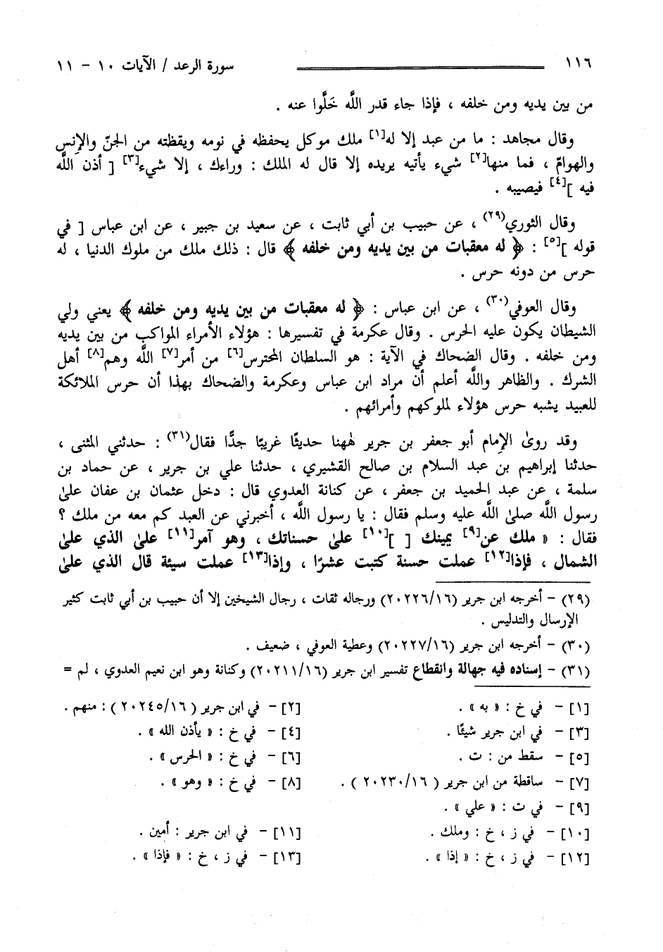 مِنْ بَيْن يَدَيْهِ وَمِنْ خَلْفه فَإِذَا جَاءَ قَدَر اللَّه خَلَوْا عَنْهُ وَقَالَ مُجَاهِد مَا مِنْ عَبْد إِلَّا لَهُ مَلَك مُوَكَّل يَحْفَظهُ فِي نَوْمه وَيَقَظَته مِنْ الْجِنّ وَالْإِنْس وَالْهَوَامّ فَمَا مِنْهَا شَيْء يَأْتِيه يُرِيدهُ إِلَّا قَالَ لَهُ الْمَلَك : وَرَاءَك إِلَّا شَيْء أَذِنَ اللَّه فِيهِ فَيُصِيبهُ وَقَالَ الثَّوْرِيّ عَنْ حَبِيب بْن أَبِي ثَابِت عَنْ سَعِيد بْن جُبَيْر عَنْ اِبْن عَبَّاس فِي قَوْله " لَهُ مُعَقِّبَات مِنْ بَيْن يَدَيْهِ وَمِنْ خَلْفه " قَالَ ذَلِكَ مَلِك مِنْ مُلُوك الدُّنْيَا لَهُ حَرَس مِنْ دُونه حَرَس وَقَالَ الْعَوْفِيّ عَنْ اِبْن عَبَّاس " لَهُ مُعَقِّبَات مِنْ بَيْن يَدَيْهِ وَمِنْ خَلْفه " يَعْنِي وَلِيّ السُّلْطَان يَكُون عَلَيْهِ الْحَرَس وَقَالَ عِكْرِمَة فِي تَفْسِيرهَا هَؤُلَاءِ الْأُمَرَاء الْمَوَاكِب مِنْ بَيْن يَدَيْهِ وَمِنْ خَلْفه ; وَقَالَ الضَّحَّاك فِي الْآيَة هُوَ السُّلْطَان الْمَحْرُوس مِنْ أَمْر اللَّه وَهُمْ أَهْل الشِّرْك وَالظَّاهِر وَاَللَّه أَعْلَم أَنَّ مُرَاد اِبْن عَبَّاس وَعِكْرِمَة وَالضَّحَّاك بِهَذَا أَنَّ حَرَس الْمَلَائِكَة لِلْعَبْدِ يُشْبِه حَرَس هَؤُلَاءِ لِمُلُوكِهِمْ وَأُمَرَائِهِمْ وَقَدْ رَوَى الْإِمَام أَبُو جَعْفَر اِبْن جَرِير هَاهُنَا حَدِيث غَرِيبًا جِدًّا فَقَالَ حَدَّثَنِي الْمُثَنَّى حَدَّثَنَا إِبْرَاهِيم بْن عَبْد السَّلَام بْن صَالِح وَهُشَيْم حَدَّثَنَا عَلِيّ بْن جَرِير عَنْ حَمَّاد بْن سَلَمَة عَنْ عَبْد الْحَمِيد بْن جَعْفَر عَنْ كِنَانَة النَّهْدِيّ النَّسَائِيّ : دَخَلَ عُثْمَان بْن مَاجَهْ عَلَى رَسُول اللَّه صَلَّى اللَّه عَلَيْهِ وَسَلَّمَ فَقَالَ يَا رَسُول اللَّه أَخْبِرْنِي عَنْ الْعَبْد كَمْ مَعَهُ مِنْ مَلَك ؟ فَقَالَ " مَلَك عَنْ يَمِينك عَلَى حَسَنَاتك وَهُوَ أَمِير