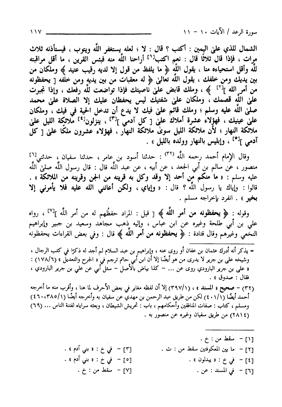 الشِّمَال لِلَّذِي عَلَى الْيَمِين اُكْتُبْهَا ؟ قَالَ لَا لَعَلَّهُ يَسْتَغْفِر وَيَتُوب فَيَسْتَأْذِنهُ ثَلَاث مَرَّات فَإِذَا قَالَ ثَلَاثًا قَالَ اُكْتُبْهَا أَرَاحَنَا اللَّه مِنْهُ فَبِئْسَ الْقَرِين مَا أَقَلّ مُرَاقَبَته لِلَّهِ وَأَقَلّ اِسْتِحْيَاءَهُ مِنَّا يَقُول اللَّه " مَا يَلْفِظ مِنْ قَوْل إِلَّا لَدَيْهِ رَقِيب عَتِيد " وَمَلَكَانِ مِنْ بَيْن يَدَيْك وَمِنْ خَلْفك يَقُول اللَّه تَعَالَى " لَهُ مُعَقِّبَات مِنْ بَيْن يَدَيْهِ وَمِنْ خَلْفه " الْآيَة ; وَمَلَك قَابِض عَلَى نَاصِيَتك فَإِذَا تَوَاضَعْت لِلَّهِ رَفَعَك وَإِذَا تَجَبَّرْت عَلَى اللَّه قَصَمَكَ ; وَمَلَكَانِ عَلَى شَفَتَيْك لَيْسَ يَحْفَظَانِ عَلَيْك إِلَّا الصَّلَاة عَلَى مُحَمَّد صَلَّى اللَّه عَلَيْهِ وَسَلَّمَ وَمَلَك قَائِم عَلَى فِيك لَا يَدَع أَنْ تَدْخُل الْحَيَّة فِي فِيك وَمَلَكَانِ عَلَى عَيْنَيْك فَهَؤُلَاءِ عَشَرَة أَمْلَاك عَلَى كُلّ آدَمِيّ يَنْزِلُونَ مَلَائِكَة اللَّيْل عَلَى مَلَائِكَة النَّهَار لِأَنَّ مَلَائِكَة اللَّيْل سِوَى مَلَائِكَة النَّهَار فَهَؤُلَاءِ عِشْرُونَ مَلَكًا عَلَى كُلّ آدَمِيّ وَإِبْلِيس بِالنَّهَارِ وَوَلَده بِاللَّيْلِ " وَقَالَ الْإِمَام أَحْمَد رَحِمَهُ اللَّه حَدَّثَنَا أَسْوَد بْن عَامِر حَدَّثَنَا سُفْيَان حَدَّثَنِي مَنْصُور عَنْ سَالِم بْن أَبِي الْجَعْد عَنْ أَبِيهِ عَنْ عَبْد اللَّه قَالَ : قَالَ رَسُول اللَّه صَلَّى اللَّه عَلَيْهِ وَسَلَّمَ " مَا مِنْكُمْ مِنْ أَحَد إِلَّا وَقَدْ وُكِّلَ بِهِ قَرِينه مِنْ الْجِنّ وَقَرِينه مِنْ الْمَلَائِكَة " قَالُوا وَإِيَّاكَ يَا رَسُول اللَّه ؟ قَالَ " وَإِيَّايَ وَلَكِنَّ اللَّه أَعَانَنِي عَلَيْهِ فَلَا يَأْمُرنِي إِلَّا بِخَيْرٍ " اِنْفَرَدَ بِإِخْرَاجِهِ مُسْلِم وَقَوْله " يَحْفَظُونَهُ مِنْ أَمْر اللَّه " قِيلَ الْمُرَاد حِفْظهمْ لَهُ مِنْ أَمْر اللَّه رَوَاهُ سُنَيْد بْن أَبِي طَلْحَة وَغَيْره عَنْ اِبْن عَبَّاس وَإِلَيْهِ ذَهَبَ مُجَاهِد وَسَعِيد بْن جُبَيْر وَإِبْرَاهِيم دَاوُدَ وَغَيْرهمْ وَقَالَ رُوِيَ" يَحْفَظُونَهُ مِنْ أَمْر اللَّه " قَالَ وَفِي بَعْض الْقِرَاءَات يَحْفَظُونَهُ