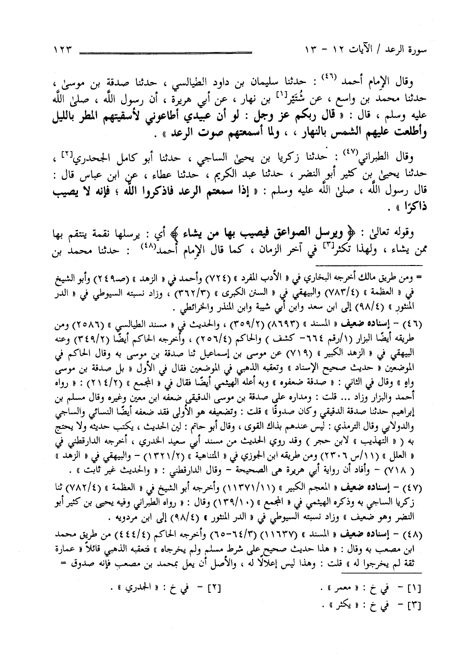 وَقَالَ الْإِمَام أَحْمَد حَدَّثَنَا سُلَيْمَان بْن دَاوُد الطَّيَالِسِيّ حَدَّثَنَا صَدَقَة بْن مُوسَى حَدَّثَنَا مُحَمَّد بْن وَاسِع عَنْ مَعْمَر بْن نَهَار عَنْ أَبِي هُرَيْرَة أَنَّ رَسُول اللَّه صَلَّى اللَّه عَلَيْهِ وَسَلَّمَ قَالَ " قَالَ رَبّكُمْ عَزَّ وَجَلَّ لَوْ أَنَّ عَبِيدِي أَطَاعُونِي لَأَسْقَيْتهمْ الْمَطَر بِاللَّيْلِ وَأَطْلَعْت عَلَيْهِمْ الشَّمْس بِالنَّهَارِ وَلَمَا أَسْمَعْتهمْ صَوْت الرَّعْد " وَقَالَ الطَّبَرَانِي حَدَّثَنَا زَكَرِيَّا بْن يَحْيَى السَّاجِيّ حَدَّثَنَا أَبُو كَامِل الْجَحْدَرِيّ حَدَّثَنَا يَحْيَى بْن كَثِير أَبُو النَّضْر حَدَّثَنَا عَبْد الْكَرِيم حَدَّثَنَا عَطَاء عَنْ اِبْن عَبَّاس قَالَ : قَالَ رَسُول اللَّه صَلَّى اللَّه عَلَيْهِ وَسَلَّمَ " إِذَا سَمِعْتُمْ الرَّعْد فَاذْكُرُوا اللَّه فَإِنَّهُ لَا يُصِيب ذَاكِرًا " وَقَوْله تَعَالَى " وَيُرْسِل الصَّوَاعِق فَيُصِيب بِهَا مَنْ يَشَاء " أَيْ يُرْسِلهَا نِقْمَة يَنْتَقِم بِهَا مِمَّنْ يَشَاء وَلِهَذَا تَكْثُر فِي آخِر الزَّمَان كَمَا قَالَ الْإِمَام أَحْمَد حَدَّثَنَا مُحَمَّد بْن