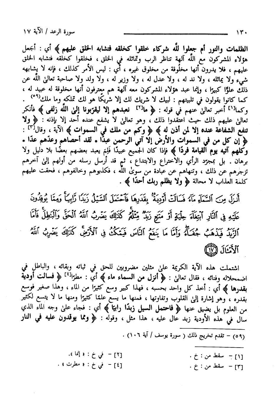 اِشْتَمَلَتْ هَذِهِ الْآيَة الْكَرِيمَة عَلَى مَثَلَيْنِ مَضْرُوبَيْنِ لِلْحَقِّ فِي ثَبَاته وَبَقَائِهِ وَالْبَاطِل فِي اِضْمِحْلَاله وَفَنَائِهِ فَقَالَ تَعَالَى " أَنْزَلَ مِنْ السَّمَاء مَاء " أَيْ مَطَرًا " فَسَالَتْ أَوْدِيَة بِقَدَرِهَا " أَيْ أَخَذَ كُلّ وَاحِد بِحَسَبِهِ فَهَذَا كَبِير وَسِعَ كَثِيرًا مِنْ الْمَاء وَهَذَا صَغِير فَوَسِعَ بِقَدْرِهِ وَهُوَ إِشَارَة إِلَى الْقُلُوب وَتَفَاوُتهَا فَمِنْهَا مَا يَسَع عِلْمًا كَثِيرًا وَمِنْهَا مَا لَا يَتَّسِع لِكَثِيرٍ مِنْ الْعُلُوم بَلْ يَضِيق عَنْهَا " فَاحْتَمَلَ السَّيْل زَبَدًا رَابِيًا " أَيْ فَجَاءَ عَلَى وَجْه الْمَاء الَّذِي سَالَ فِي هَذِهِ الْأَوْدِيَة زَبَد عَالٍ عَلَيْهِ هَذَا مَثَل وَقَوْله " وَمِمَّا يُوقِدُونَ عَلَيْهِ فِي النَّار