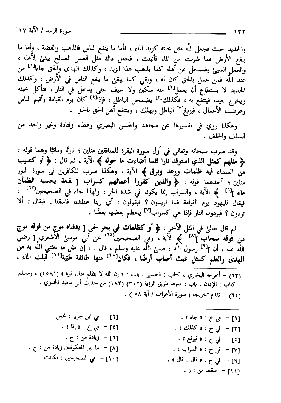 كَزَبَدِ الْمَاء فَأَمَّا مَا يَنْفَع النَّاس فَالذَّهَب وَالْفِضَّة وَأَمَّا مَا يَنْفَع الْأَرْض فَمَا شَرِبَتْ مِنْ الْمَاء فَأَنْبَتَتْ فَجُعِلَ ذَاكَ مِثْل الْعَمَل الصَّالِح يَبْقَى لِأَهْلِهِ وَالْعَمَل السَّيِّئ يَضْمَحِلّ عَنْ أَهْله كَمَا يَذْهَب هَذَا الزَّبَد وَكَذَلِكَ الْهُدَى وَالْحَقّ جَاءَا مِنْ عِنْد اللَّه فَمَنْ عَمِلَ بِالْحَقِّ كَانَ لَهُ وَبَقِيَ كَمَا بَقِيَ مَا يَنْفَع النَّاس فِي الْأَرْض وَكَذَلِكَ الْحَدِيد لَا يُسْتَطَاع أَنْ يُعْمَل مِنْهُ سِكِّين وَلَا سَيْف حَتَّى يُدْخَل فِي النَّار فَتَأْكُل خَبَثه وَيَخْرُج جَيِّده فَيُنْتَفَع بِهِ فَكَذَلِكَ يَضْمَحِلّ الْبَاطِل فَإِذَا كَانَ يَوْم الْقِيَامَة وَأُقِيمَ النَّاس وَعُرِضَتْ الْأَعْمَال فَيَزِيغ الْبَاطِل وَيَهْلِك وَيَنْتَفِع أَهْل الْحَقّ بِالْحَقِّ وَهَكَذَا رُوِيَ فِي تَفْسِيرهَا عَنْ مُجَاهِد وَالْحَسَن الْبَصْرِيّ وَعَطَاء وَقَتَادَة وَغَيْر وَاحِد مِنْ السَّلَف وَالْخَلَف وَقَدْ ضَرَبَ سُبْحَانه وَتَعَالَى فِي أَوَّل سُورَة الْبَقَرَة لِلْمُنَافِقِينَ مَثَلَيْنِ نَارِيًّا وَمَائِيًّا وَهُمَا قَوْله " مَثَلهمْ كَمَثَلِ الَّذِي اِسْتَوْقَدَ نَارًا فَلَمَّا أَضَاءَتْ مَا حَوْله " الْآيَة ثُمَّ قَالَ " أَوْ كَصَيِّبٍ مِنْ السَّمَاء فِيهِ ظُلُمَات وَرَعْد وَبَرْق " الْآيَة وَهَكَذَا ضَرَبَ لِلْكَافِرِينَ فِي سُورَة النُّور مَثَلَيْنِ " أَحَدهمَا " قَوْله " وَاَلَّذِينَ كَفَرُوا أَعْمَالهمْ كَسَرَابٍ " الْآيَة وَالسَّرَاب إِنَّمَا يَكُون فِي شِدَّة الْحَرّ وَلِهَذَا جَاءَ فِي الصَّحِيحَيْنِ فَيُقَال لِلْيَهُودِ يَوْم الْقِيَامَة فَمَا تُرِيدُونَ ؟ فَيَقُولُونَ أَيْ رَبّنَا عَطِشْنَا فَاسْقِنَا فَيُقَال أَلَا تَرِدُونَ ؟ فَيَرِدُونَ النَّار فَإِذَا هِيَ كَسَرَابٍ يَحْطِم بَعْضهَا بَعْضًا ثُمَّ قَالَ تَعَالَى فِي الْمَثَل الْآخَر " أَوْ كَظُلُمَاتٍ فِي بَحْر لُجِّيّ " الْآيَة وَفِي الصَّحِيحَيْنِ عَنْ أَبِي مُوسَى الْأَشْعَرِيّ رَضِيَ اللَّه عَنْهُ أَنَّ رَسُول اللَّه صَلَّى اللَّه عَلَيْهِ وَسَلَّمَ قَالَ " إِنَّ مَثَل مَا بَعَثَنِي اللَّه بِهِ مِنْ الْهُدَى وَالْعِلْم كَمَثَلِ غَيْث أَصَابَ أَرْضًا فَكَانَ مِنْهَا طَائِفَة قَبِلَتْ الْمَاء