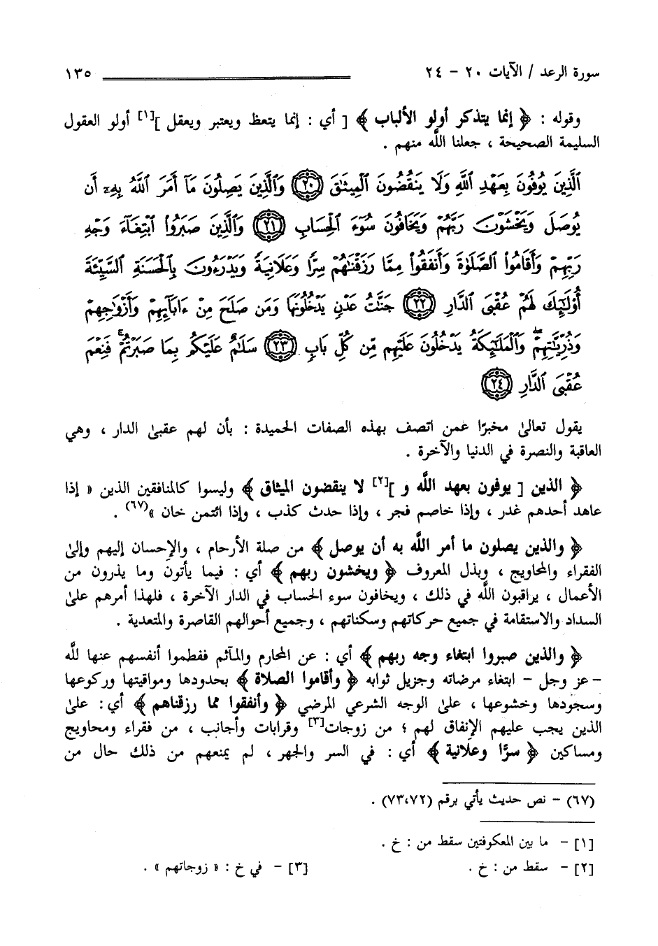 وَاَلَّذِينَ صَبَرُوا اِبْتِغَاء وَجْه رَبّهمْ " أَيْ عَنْ الْمَحَارِم وَالْمَآثِم فَفَطَمُوا أَنْفُسهمْ عَنْهَا لِلَّهِ عَزَّ وَجَلَّ اِبْتِغَاء مَرْضَاته وَجَزِيل ثَوَابه " وَأَقَامُوا الصَّلَاة " بِحُدُودِهَا وَمَوَاقِيتهَا وَرُكُوعهَا وَسُجُودهَا وَخُشُوعهَا عَلَى الْوَجْه الشَّرْعِيّ الْمَرْضِيّ" وَأَنْفَقُوا مِمَّا رَزَقْنَاهُمْ " أَيْ عَلَى الَّذِينَ يَجِب عَلَيْهِمْ الْإِنْفَاق لَهُمْ مِنْ زَوْجَات وَقَرَابَات وَأَجَانِب مِنْ فُقَرَاء وَمَحَاوِيج وَمَسَاكِين " سِرًّا وَعَلَانِيَة " أَيْ فِي السِّرّ وَالْجَهْر لَمْ يَمْنَعهُمْ مِنْ ذَلِكَ حَال مِنْ