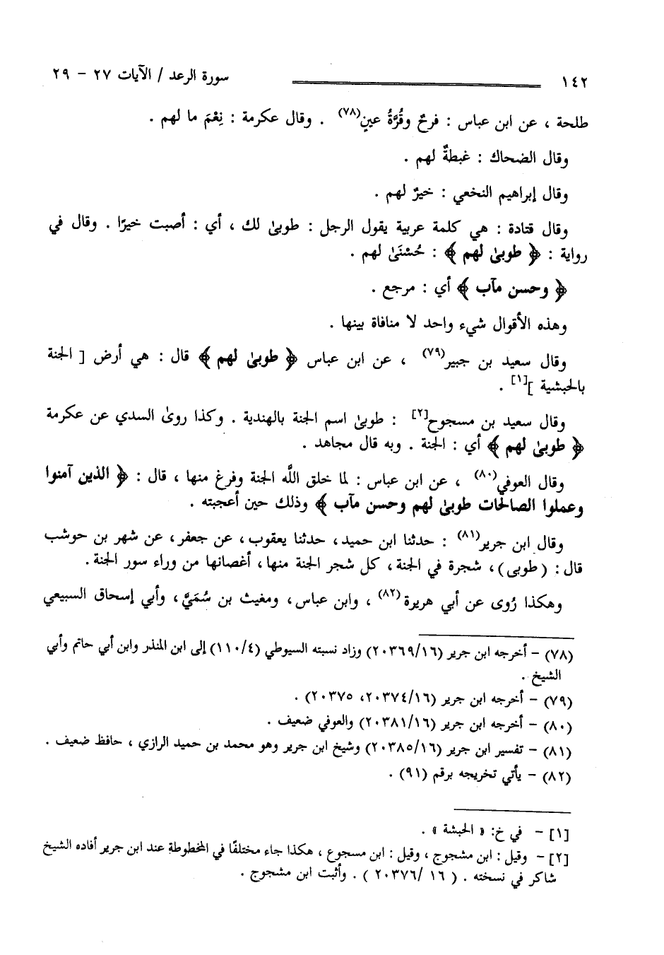 وَقَالَ عِكْرِمَة نِعْمَ مَالهمْ وَقَالَ الضَّحَّاك غِبْطَة لَهُمْ وَقَالَ إِبْرَاهِيم دَاوُدَ خَيْر لَهُمْ ; وَقَالَ قَتَادَة هِيَ كَلِمَة عَرَبِيَّة يَقُول الرَّجُل طُوبَى لَك أَيْ أَصَبْت خَيْرًا وَقَالَ فِي رِوَايَة : طُوبَى لَهُمْ حُسْنَى لَهُمْ " وَحُسْن مَآب" أَيْ مَرْجِع وَهَذِهِ الْأَقْوَال شَيْء وَاحِد لَا مُنَافَاة بَيْنهَا وَقَالَ سَعِيد بْن جُبَيْر عَنْ اِبْن عَبَّاس " طُوبَى لَهُمْ " قَالَ هِيَ أَرْض الْجَنَّة بِالْحَبَشِيَّةِ وَقَالَ سَعِيد بْن مَسْجُوع طُوبَى اِسْم الْجَنَّة بِالْهِنْدِيَّةِ وَكَذَا رَوَى السُّدِّيّ عَنْ عِكْرِمَة طُوبَى لَهُمْ أَيْ الْجَنَّة وَبِهِ قَالَ مُجَاهِد وَقَالَ الْعَوْفِيّ عَنْ اِبْن عَبَّاس لَمَّا خَلَقَ اللَّه الْجَنَّة وَفَرَغَ مِنْهَا قَالَ " الَّذِينَ آمَنُوا وَعَمِلُوا الصَّالِحَات طُوبَى لَهُمْ وَحُسْن مَآب " وَذَلِكَ حِين أَعْجَبَتْهُ .