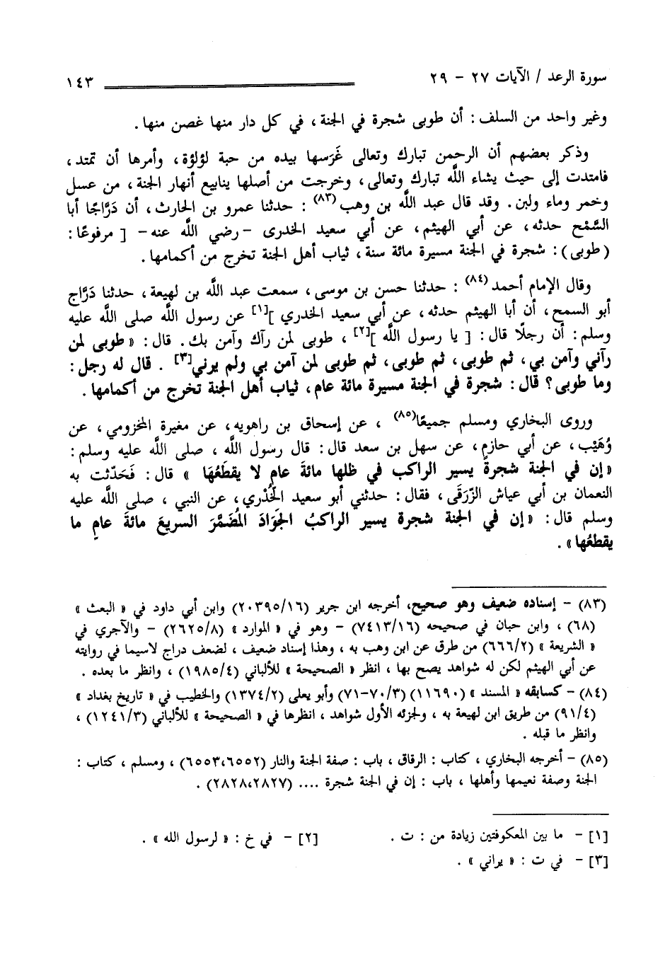 وَقَالَ الْإِمَام أَحْمَد : حَدَّثَنَا حَسَن بْن مُوسَى سَمِعْت عَبْد اللَّه بْن لَهِيعَة حَدَّثَنَا دَرَّاج أَبُو السَّمْح أَنَّ أَبَا الْهَيْثَم حَدَّثَهُ عَنْ أَبِي سَعِيد الْخُدْرِيّ عَنْ رَسُول اللَّه صَلَّى اللَّه عَلَيْهِ وَسَلَّمَ أَنَّ رَجُلًا قَالَ : يَا رَسُول اللَّه طُوبَى لِمَنْ رَآك وَآمَنَ بِك قَالَ" طُوبَى لِمَنْ رَآنِي وَآمَنَ بِي وَطُوبَى ثُمَّ طُوبَى ثُمَّ طُوبَى لِمَنْ آمَنَ بِي وَلَمْ يَرَنِي " قَالَ لَهُ رَجُل : وَمَا طُوبَى ؟ قَالَ " شَجَرَة فِي الْجَنَّة مَسِيرَتهَا مِائَة عَام ثِيَاب أَهْل الْجَنَّة تَخْرُج مِنْ أَكْمَامهَا " وَرَوَى الْبُخَارِيّ وَمُسْلِم جَمِيعًا عَنْ إِسْحَاق بْن رَاهْوَيْهِ عَنْ مُغِيرَة الْمَخْزُومِيّ عَنْ وُهَيْب عَنْ أَبِي حَازِم عَنْ سَهْل بْن سَعْد رَضِيَ اللَّه عَنْهُ أَنَّ رَسُول اللَّه صَلَّى اللَّه عَلَيْهِ وَعَلَى آلِهِ وَسَلَّمَ قَالَ " وَإِنَّ فِي الْجَنَّة شَجَرَة يَسِير الرَّاكِب فِي ظِلّهَا مِائَة عَام لَا يَقْطَعهَا " قَالَ فَحَدَّثْت بِهِ النُّعْمَان بْن أَبِي عَيَّاش الزُّرَقِيّ فَقَالَ : حَدَّثَنِي أَبُو سَعِيد الْخُدْرِيّ عَنْ النَّبِيّ صَلَّى اللَّه عَلَيْهِ وَعَلَى آلِهِ وَسَلَّمَ قَالَ" إِنَّ فِي الْجَنَّة شَجَرَة يَسِير الرَّاكِب الْجَوَاد الْمُضَمَّر السَّرِيع مِائَة عَام لَا يَقْطَعهَا "