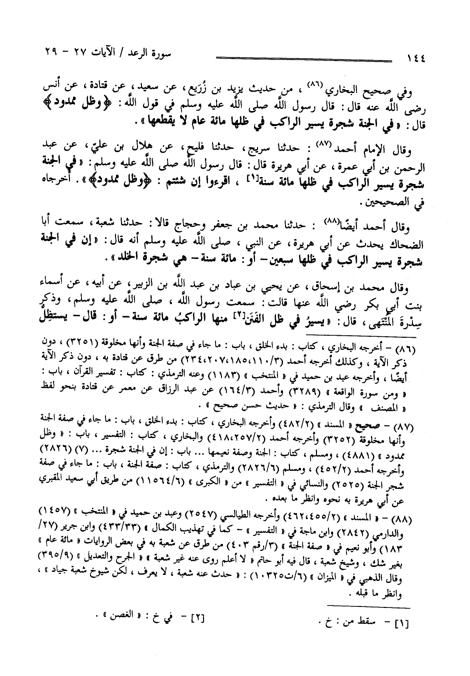 وَفِي صَحِيح الْبُخَارِيّ مِنْ حَدِيث يَزِيد بْن زُرَيْع عَنْ سَعِيد عَنْ رُوِيَ عَنْ أَنَس رَضِيَ اللَّه عَنْهُ قَالَ : قَالَ رَسُول اللَّه صَلَّى اللَّه عَلَيْهِ وَسَلَّمَ فِي قَوْل اللَّه تَعَالَى " وَظِلّ مَمْدُود " قَالَ " فِي الْجَنَّة شَجَرَة يَسِير الرَّاكِب فِي ظِلّهَا مِائَة عَام لَا يَقْطَعهَا " وَقَالَ الْإِمَام أَحْمَد : حَدَّثَنَا شُرَيْح حَدَّثَنَا فُلَيْح عَنْ هِلَال بْن عَلِيّ عَنْ عَبْد الرَّحْمَن بْن أَبِي عَمْرَة عَنْ أَبِي هُرَيْرَة قَالَ : قَالَ رَسُول اللَّه صَلَّى اللَّه عَلَيْهِ وَسَلَّمَ " فِي الْجَنَّة شَجَرَة يَسِير الرَّاكِب فِي ظِلّهَا مِائَة سَنَة اِقْرَءُوا إِنْ شِئْتُمْ " وَظِلّ مَمْدُود " أَخْرَجَاهُ فِي الصَّحِيحَيْنِ وَفِي لَفْظ لِأَحْمَدَ أَيْضًا حَدَّثَنَا مُحَمَّد بْن جَعْفَر وَحَجَّاج قَالَا : حَدَّثَنَا شُعْبَة سَمِعْت أَبَا الضَّحَّاك يُحَدِّث عَنْ أَبِي هُرَيْرَة عَنْ النَّبِيّ صَلَّى اللَّه عَلَيْهِ وَسَلَّمَ أَنَّهُ قَالَ " إِنَّ فِي الْجَنَّة شَجَرَة يَسِير الرَّاكِب فِي ظِلّهَا سَبْعِينَ - أَوْ مِائَة سَنَة - هِيَ شَجَرَة الْخُلْد" وَقَالَ مُحَمَّد بْن إِسْحَاق عَنْ يَحْيَى بْن عَبَّاد بْن عَبْد اللَّه بْن الزُّبَيْر عَنْ أَبِيهِ عَنْ أَسْمَاء بِنْت أَبِي بَكْر رَضِيَ اللَّه عَنْهُ قَالَتْ : سَمِعْت رَسُول اللَّه صَلَّى اللَّه عَلَيْهِ وَسَلَّمَ ذَكَرَ سِدْرَة الْمُنْتَهَى فَقَالَ " يَسِير فِي ظِلّ الْغُصْن مِنْهَا الرَّاكِب مِائَة سَنَة - أَوْ قَالَ – يَسْتَظِلّ