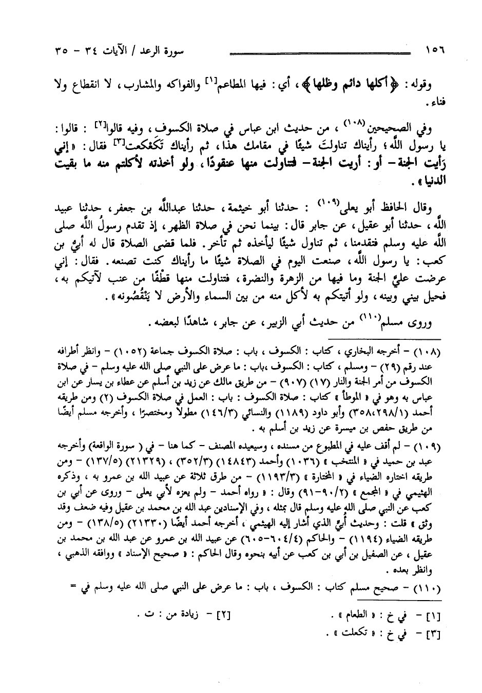 وَقَوْله " أُكُلهَا دَائِم وَظِلّهَا " أَيْ فِيهَا الْفَوَاكِه وَالْمَطَاعِم وَالْمَشَارِب لَا اِنْقِطَاع وَلَا فَنَاء وَفِي الصَّحِيحَيْنِ مِنْ حَدِيث اِبْن عَبَّاس فِي صَلَاة الْكُسُوف وَفِيهِ قَالُوا : يَا رَسُول اللَّه رَأَيْنَاك تَنَاوَلْت شَيْئًا فِي مَقَامك هَذَا ثُمَّ رَأَيْنَاك تَكَعْكَعْت فَقَالَ " إِنِّي رَأَيْت الْجَنَّة - أَوْ أُرِيت الْجَنَّة - فَتَنَاوَلْت مِنْهَا عُنْقُودًا وَلَوْ أَخَذْته لَأَكَلْتُمْ مِنْهُ مَا بَقِيَتْ الدُّنْيَا " وَقَالَ الْحَافِظ أَبُو يَعْلَى : حَدَّثَنَا أَبُو خَيْمَة حَدَّثَنَا عَبْد اللَّه بْن جَعْفَر حَدَّثَنَا عُبَيْد اللَّه حَدَّثَنَا أَبُو عُقَيْل عَنْ جَابِر قَالَ : بَيْنَمَا نَحْنُ فِي صَلَاة الظُّهْر إِذْ تَقَدَّمَ رَسُول اللَّه صَلَّى اللَّه عَلَيْهِ وَسَلَّمَ فَتَقَدَّمْنَا ثُمَّ تَنَاوَلَ شَيْئًا لِيَأْخُذهُ ثُمَّ تَأَخَّرَ فَلَمَّا قَضَى الصَّلَاة قَالَ لَهُ أُبَيّ بْن كَعْب يَا رَسُول اللَّه صَنَعْت الْيَوْم فِي الصَّلَاة شَيْئًا مَا رَأَيْنَاك كُنْت تَصْنَعهُ فَقَالَ " إِنِّي عُرِضَتْ عَلَيَّ الْجَنَّة وَمَا فِيهَا مِنْ الزَّهْرَة وَالنَّضْرَة فَتَنَاوَلْت مِنْهَا قِطْفًا مِنْ عِنَب لِآتِيَكُمْ بِهِ فَحِيلَ بَيْنِي وَبَيْنه وَلَوْ أَتَيْتُكُمْ بِهِ لَأَكَلَ مِنْهُ مَنْ بَيْن السَّمَاء وَالْأَرْض لَا يُنْقِصُونَهُ " وَرَوَى مُسْلِم مِنْ حَدِيث أَبِي الزُّبَيْر عَنْ جَابِر شَاهِدًا لِبَعْضِهِ