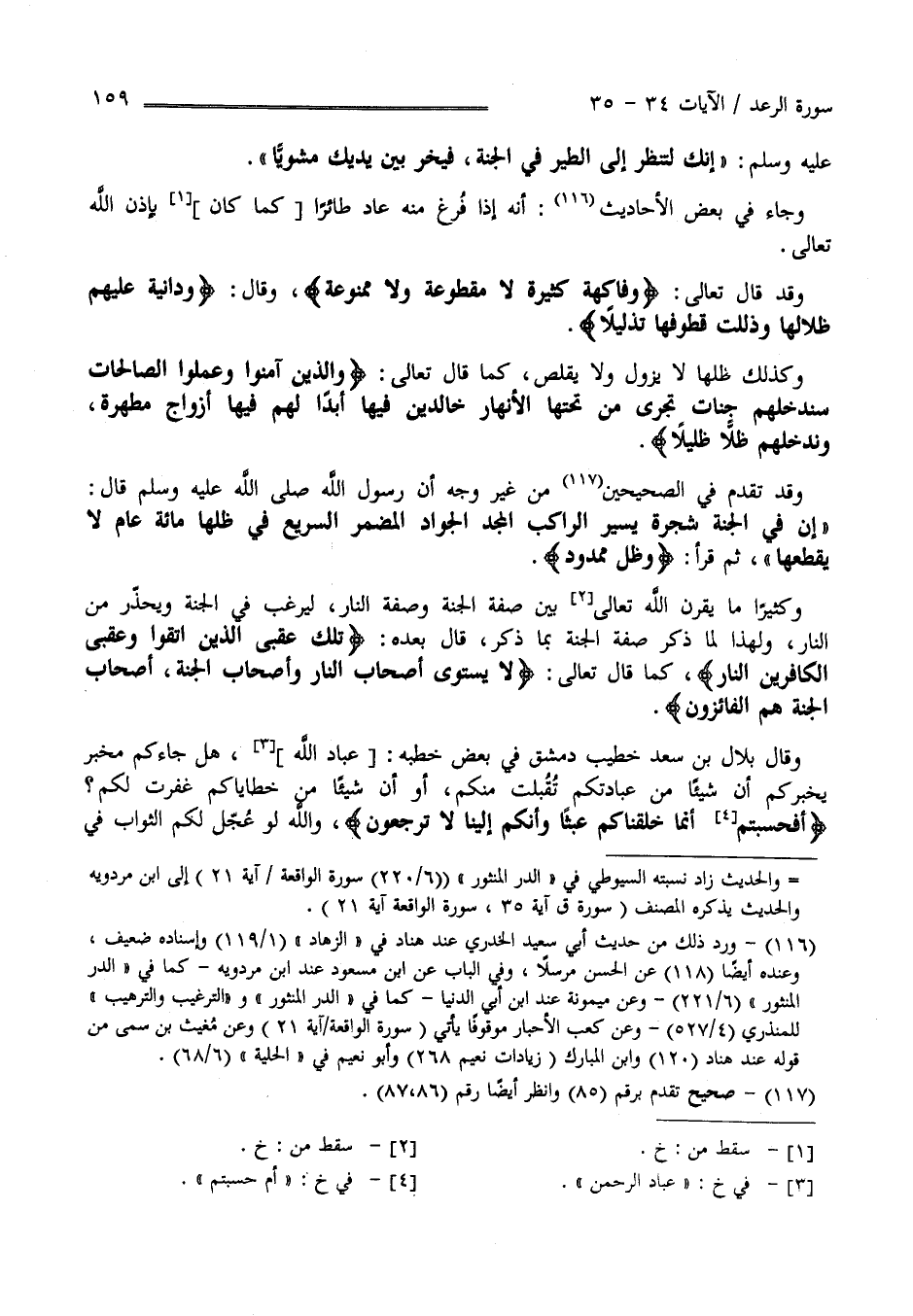 عَلَيْهِ وَسَلَّمَ " إِنَّك لَتَنْظُر إِلَى الطَّيْر فِي الْجَنَّة فَيَخِرّ بَيْن يَدَيْك مَشْوِيًّا" وَجَاءَ فِي بَعْض الْأَحَادِيث أَنَّهُ إِذَا فَرَغَ مِنْهُ عَادَ طَائِرًا كَمَا كَانَ بِإِذْنِ اللَّه تَعَالَى وَقَدْ قَالَ اللَّه تَعَالَى " وَفَاكِهَة كَثِيرَة لَا مَقْطُوعَة وَلَا مَمْنُوعَة " وَقَالَ" وَدَانِيَة عَلَيْهِمْ ظِلَالهَا وَذُلِّلَتْ قُطُوفهَا تَذْلِيلًا" وَكَذَلِكَ ظِلّهَا لَا يَزُول وَلَا يُقَلَّص كَمَا قَالَ تَعَالَى" وَاَلَّذِينَ آمَنُوا وَعَمِلُوا الصَّالِحَات سَنُدْخِلُهُمْ جَنَّات تَجْرِي مِنْ تَحْتهَا الْأَنْهَار خَالِدِينَ فِيهَا أَبَدًا لَهُمْ فِيهَا أَزْوَاج مُطَهَّرَة وَنُدْخِلهُمْ ظِلًّا ظَلِيلًا " وَقَدْ تَقَدَّمَ فِي الصَّحِيحَيْنِ مِنْ غَيْر وَجْه أَنَّ رَسُول اللَّه صَلَّى اللَّه عَلَيْهِ وَسَلَّمَ قَالَ " إِنَّ فِي الْجَنَّة شَجَرَة يَسِير الرَّاكِب الْمُجِدّ الْجَوَاد الْمُضَمَّر السَّرِيع فِي ظِلّهَا مِائَة عَام لَا يَقْطَعهَا " ثُمَّ قَرَأَ " وَظِلّ مَمْدُود " وَكَثِيرًا مَا يَقْرِن اللَّه تَعَالَى بَيْن صِفَة الْجَنَّة وَصِفَة النَّار لِيُرَغِّب فِي الْجَنَّة وَيُحَذِّر مِنْ النَّار وَلِهَذَا لَمَّا ذَكَرَ صِفَة الْجَنَّة بِمَا ذَكَرَ قَالَ بَعْده " تِلْكَ عُقْبَى الَّذِينَ اِتَّقَوْا وَعُقْبَى الْكَافِرِينَ النَّار " كَمَا قَالَ تَعَالَى " لَا يَسْتَوِي أَصْحَاب النَّار وَأَصْحَاب الْجَنَّة أَصْحَاب الْجَنَّة هُمْ الْفَائِزُونَ " وَقَالَ بِلَال بْن سَعْد خَطِيب دِمَشْق فِي بَعْض خُطَبه : عِبَاد اللَّه هَلْ جَاءَكُمْ مُخْبِر يُخْبِركُمْ أَنَّ شَيْئًا مِنْ عِبَادَتكُمْ تُقُبِّلَتْ مِنْكُمْ أَوْ أَنَّ شَيْئًا مِنْ خَطَاكُمْ غُفِرَتْ لَكُمْ ؟ " أَفَحَسِبْتُمْ أَنَّمَا خَلَقْنَاكُمْ عَبَثًا وَأَنَّكُمْ إِلَيْنَا لَا تُرْجَعُونَ " وَاَللَّه لَوْ عُجِّلَ لَكُمْ الثَّوَاب فِي