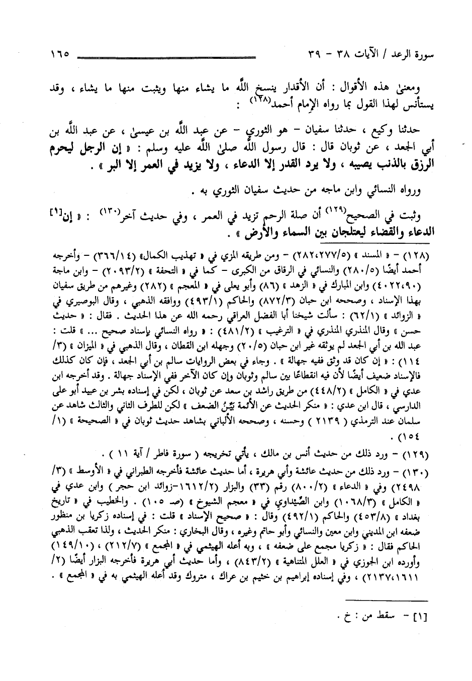 بْن أَبِي الْجَعْد عَنْ ثَوْبَان قَالَ : قَالَ رَسُول اللَّه " إِنَّ الرَّجُل لَيُحْرَم الرِّزْق بِالذَّنْبِ يُصِيبهُ وَلَا يَرُدّ الْقَدَر إِلَّا الدُّعَاء وَلَا يَزِيد فِي الْعُمُر إِلَّا الْبِرّ " وَرَوَاهُ النَّسَائِيّ وَابْن مَاجَهْ مِنْ حَدِيث سُفْيَان الثَّوْرِيّ بِهِ وَثَبَتَ فِي الصَّحِيح أَنَّ صِلَة الرَّحِم تَزِيد فِي الْعُمْر وَفِي حَدِيث آخَر" إِنَّ الدُّعَاء وَالْقَضَاء لَيَعْتَلِجَانِ بَيْن السَّمَاء وَالْأَرْض
