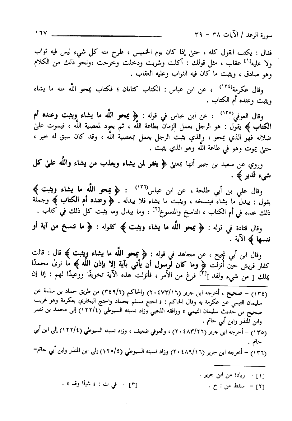 فَقَالَ يَكْتُب الْقَوْل كُلّه حَتَّى إِذَا كَانَ يَوْم الْخَمِيس طَرَحَ مِنْهُ كُلّ شَيْء لَيْسَ فِيهِ ثَوَاب وَلَا عِقَاب مِثْل قَوْلك أَكَلْت وَشَرِبْت دَخَلْت وَخَرَجْت وَنَحْو ذَلِكَ مِنْ الْكَلَام وَهُوَ صَادِق وَيُثْبِت مَا كَانَ فِيهِ الثَّوَاب وَعَلَيْهِ الْعِقَاب وَقَالَ عِكْرِمَة عَنْ اِبْن عَبَّاس : الْكِتَاب كِتَابَانِ فَكِتَاب يَمْحُو اللَّه مِنْهُ مَا يَشَاء وَيُثْبِت وَعِنْده أُمّ الْكِتَاب وَقَالَ الْعَوْفِيّ عَنْ اِبْن عَبَّاس فِي قَوْله " يَمْحُو اللَّه مَا يَشَاء وَيُثْبِت وَعِنْده أُمّ الْكِتَاب " يَقُول هُوَ الرَّجُل يَعْمَل الزَّمَان بِطَاعَةِ اللَّه ثُمَّ يَعُود لِمَعْصِيَةِ اللَّه فَيَمُوت عَلَى ضَلَالَة فَهُوَ الَّذِي يَمْحُو وَاَلَّذِي يُثْبِت الرَّجُل يَعْمَل بِمَعْصِيَةِ اللَّه وَقَدْ كَانَ سَبَقَ لَهُ خَيْر حَتَّى يَمُوت وَهُوَ فِي طَاعَة اللَّه وَهُوَ الَّذِي يُثْبَت وَرُوِيَ عَنْ سَعِيد بْن جُبَيْر أَنَّهَا بِمَعْنَى " يَغْفِر لِمَنْ يَشَاء وَيُعَذِّب مَنْ يَشَاء وَاَللَّه عَلَى كُلّ شَيْء قَدِير " وَقَالَ عَلِيّ بْن أَبِي طَلْحَة عَنْ اِبْن عَبَّاس " يَمْحُو اللَّه مَا يَشَاء وَيُثْبِت " يَقُول يُبَدِّل مَا يَشَاء فَيَنْسَخهُ وَيُثْبِت مَا يَشَاء فَلَا يُبَدِّلهُ " وَعِنْده أُمّ الْكِتَاب " وَجُمْلَة ذَلِكَ عِنْده فِي أُمّ الْكِتَاب النَّاسِخ وَمَا يُبَدِّل وَمَا يُثْبِت كُلّ ذَلِكَ فِي كِتَاب وَقَالَ قَتَادَة فِي قَوْله " يَمْحُو اللَّه مَا يَشَاء وَيُثْبِت " كَقَوْلِهِ " مَا نَنْسَخ مِنْ آيَة أَوْ نُنْسِهَا " الْآيَة وَقَالَ اِبْن أَبِي