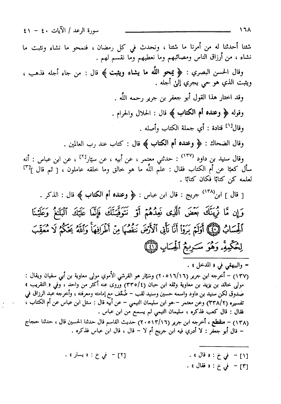 وَإِنْ مَا نُرِيَنَّكَ بَعْضَ الَّذِي نَعِدُهُمْ أَوْ نَتَوَفَّيَنَّكَ فَإِنَّمَا عَلَيْكَ الْبَلَاغُ وَعَلَيْنَا الْحِسَابُ (40)