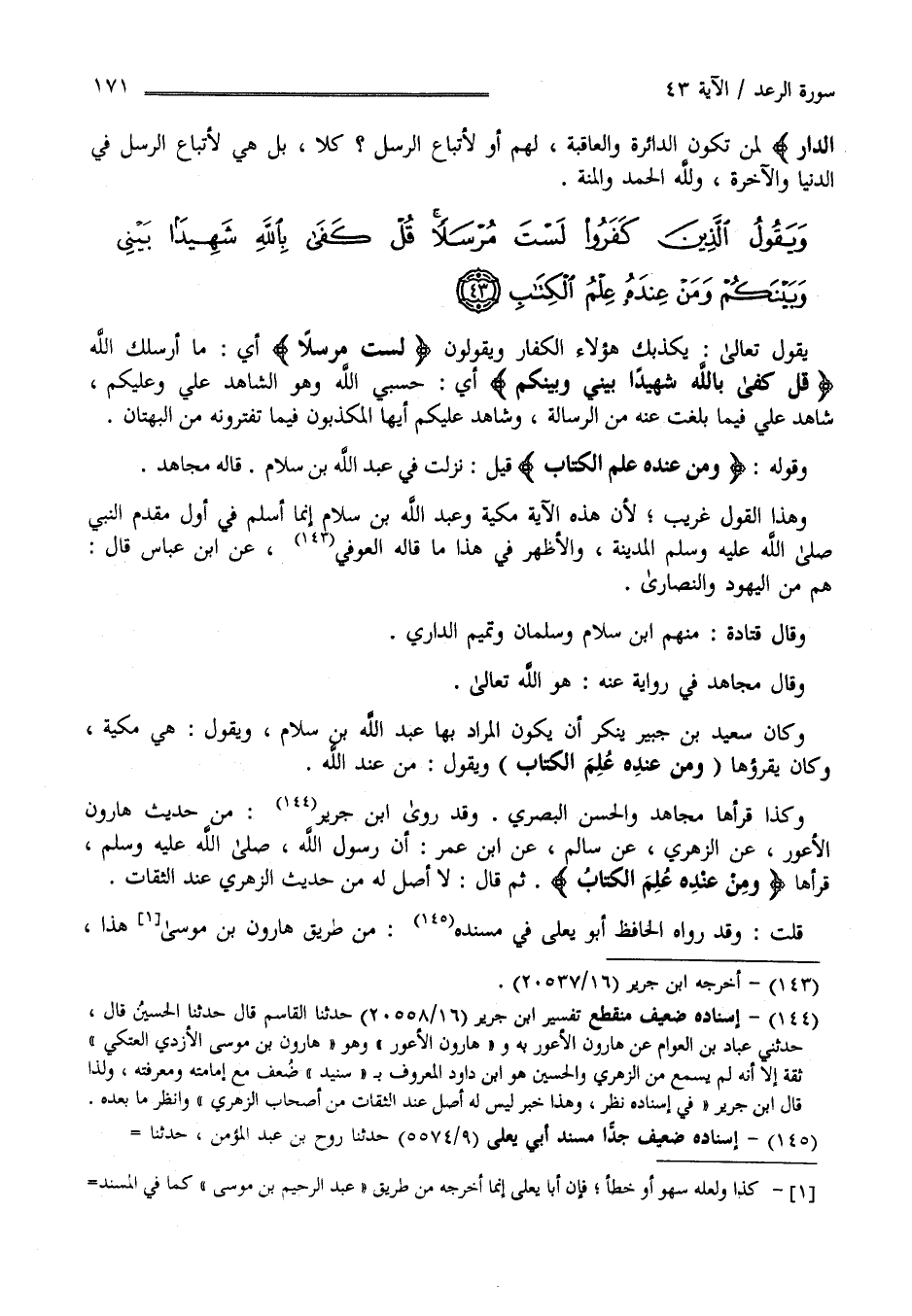 وَقَدْ رَوَى اِبْن جَرِير مِنْ حَدِيث هَارُون الْأَعْوَر عَنْ الزُّهْرِيّ عَنْ سَالِم عَنْ اِبْن عُمَر أَنَّ رَسُول اللَّه صَلَّى اللَّه عَلَيْهِ وَسَلَّمَ قَرَأَهَا " وَمِنْ عِنْده عِلْم الْكِتَاب " ثُمَّ قَالَ لَا أَصْل لَهُ مِنْ حَدِيث الزُّهْرِيّ عِنْد الثِّقَات قُلْت : وَقَدْ رَوَاهُ الْحَافِظ أَبُو يَعْلَى فِي مُسْنَده مِنْ طَرِيق هَارُون بْن مُوسَى هَذَا
