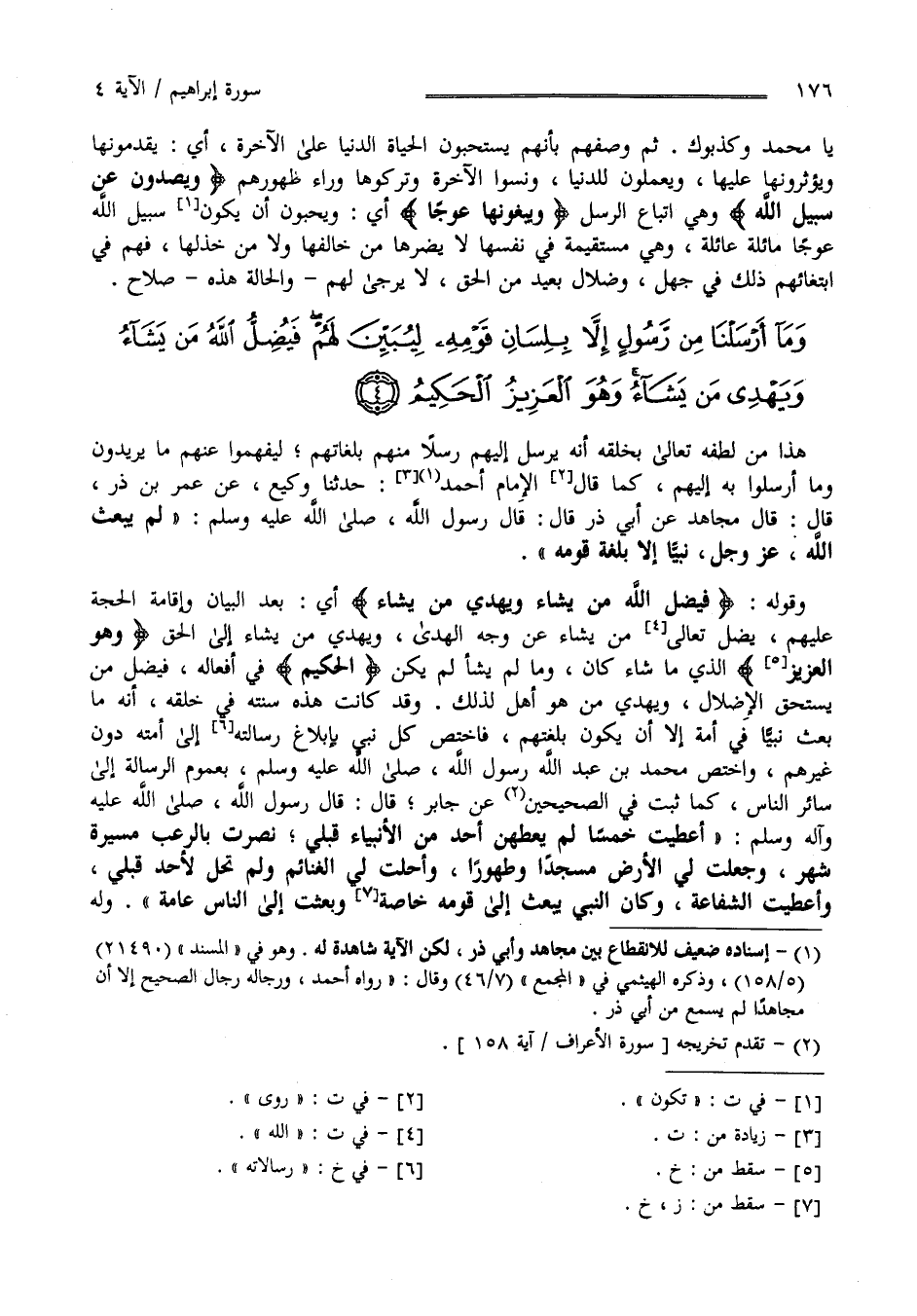 هَذَا مِنْ لُطْفه تَعَالَى بِخَلْقِهِ أَنَّهُ يُرْسِل إِلَيْهِمْ رُسُلًا مِنْهُمْ بِلُغَاتِهِمْ لِيَفْهَمُوا عَنْهُمْ مَا يُرِيدُونَ وَمَا أُرْسِلُوا بِهِ إِلَيْهِمْ كَمَا رَوَى الْإِمَام أَحْمَد حَدَّثَنَا وَكِيع عَنْ عُمَر بْن ذَرّ قَالَ : قَالَ مُجَاهِد عَنْ أَبِي ذَرّ قَالَ : قَالَ رَسُول اللَّه صَلَّى اللَّه عَلَيْهِ وَسَلَّمَ " لَمْ يَبْعَث اللَّه عَزَّ وَجَلَّ نَبِيًّا إِلَّا بِلُغَةِ قَوْمِهِ " وَقَوْله " فَيُضِلّ اللَّه مَا يَشَاء وَيَهْدِي مَنْ يَشَاء" أَيْ بَعْد الْبَيَان وَإِقَامَة الْحُجَّة عَلَيْهِمْ يُضِلّ اللَّه مَنْ يَشَاء عَنْ وَجْه الْهُدَى وَيَهْدِي مَنْ يَشَاء إِلَى الْحَقّ" وَهُوَ الْعَزِيز " الَّذِي مَا شَاءَ كَانَ وَمَا لَمْ يَشَأْ لَمْ يَكُنْ " الْحَكِيم " فِي أَفْعَاله فَيُضِلّ مَنْ يَسْتَحِقّ الْإِضْلَال وَيَهْدِي مَنْ هُوَ أَهْل لِذَلِكَ وَقَدْ كَانَتْ هَذِهِ سُنَّتَهُ فِي خَلْقه أَنَّهُ مَا بَعَثَ نَبِيًّا فِي أُمَّة إِلَّا أَنْ يَكُون بِلُغَتِهِمْ فَاخْتُصَّ كُلّ نَبِيّ بِإِبْلَاغِ رِسَالَته إِلَى أُمَّته دُون غَيْرهمْ وَاخْتُصَّ مُحَمَّد بْن عَبْد اللَّه رَسُول اللَّه صَلَّى اللَّه عَلَيْهِ وَسَلَّمَ بِعُمُومِ الرِّسَالَة إِلَى سَائِر النَّاس كَمَا ثَبَتَ فِي الصَّحِيحَيْنِ عَنْ جَابِر قَالَ : قَالَ رَسُول اللَّه صَلَّى اللَّه عَلَيْهِ وَآله وَسَلَّمَ " أُعْطِيت خَمْسًا لَمْ يُعْطَهُنَّ أَحَد مِنْ الْأَنْبِيَاء قَبْلِي : نُصِرْت بِالرُّعْبِ مَسِيرَة شَهْر وَجُعِلَتْ لِيَ الْأَرْض مَسْجِدًا وَطَهُورًا وَأُحِلَّتْ لِيَ الْغَنَائِم وَلَمْ تَحِلّ لِأَحَدٍ قَبْلِي وَأُعْطِيت الشَّفَاعَة وَكَانَ النَّبِيّ يُبْعَث إِلَى قَوْمه خَاصَّة وَبُعِثْت إِلَى النَّاسِ عَامَّةً " وَلَهُ