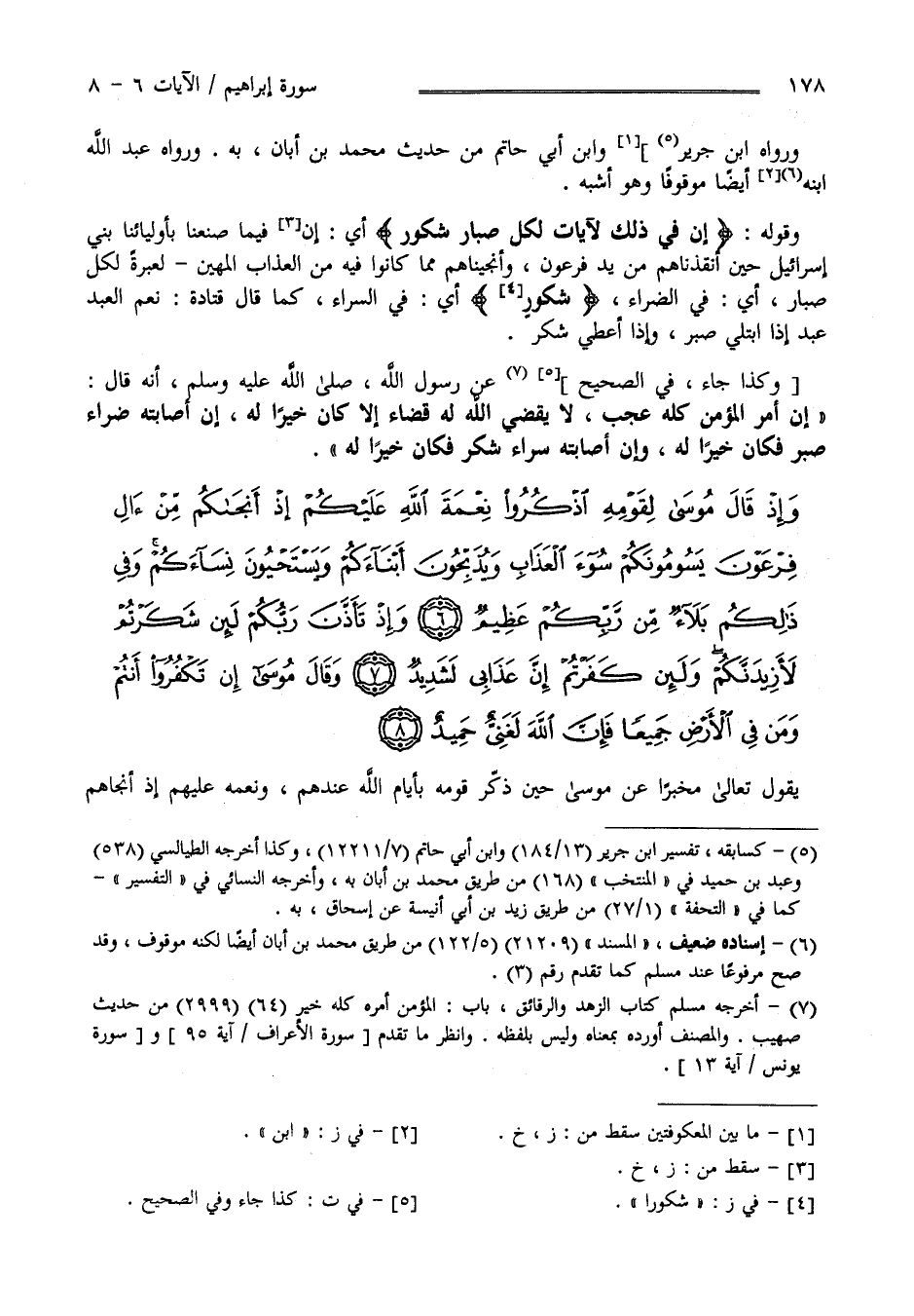وَرَوَاهُ اِبْن جَرِير وَابْن أَبِي حَاتِم مِنْ حَدِيث مُحَمَّد بْن أَبَان بِهِ وَرَوَاهُ عَبْد اللَّه اِبْنه أَيْضًا مَوْقُوفًا وَهُوَ شَبَه ; وَقَوْله " إِنَّ فِي ذَلِكَ لَآيَات لِكُلِّ صَبَّارٍ شَكُورٍ" أَيْ إِنَّ فِي مَا صَنَعْنَا بِأَوْلِيَائِنَا بَنِي إِسْرَائِيل حِين أَنْقَذْنَاهُمْ مِنْ يَد فِرْعَوْن وَأَنْجَيْنَاهُمْ مِمَّا كَانُوا فِيهِ مِنْ الْعَذَاب الْمُهِين لَعِبْرَةً لِكُلِّ صَبَّار أَيْ فِي الضَّرَّاء شَكُور أَيْ فِي السَّرَّاء كَمَا قَالَ قَتَادَة : نِعْمَ الْعَبْد عَبْد إِذَا اُبْتُلِيَ صَبَرَ وَإِذَا أُعْطِيَ شَكَرَ وَكَذَا جَاءَ فِي الصَّحِيح عَنْ رَسُول اللَّه صَلَّى اللَّه عَلَيْهِ وَسَلَّمَ أَنَّهُ قَالَ " إِنَّ أَمْرَ الْمُؤْمِنِ كُلَّهُ عَجَبٌ لَا يَقْضِي اللَّهُ لَهُ قَضَاءً إِلَّا كَانَ خَيْرًا لَهُ إِنْ أَصَابَتْهُ ضَرَّاءُ صَبَرَ فَكَانَ خَيْرًا لَهُ وَإِنْ أَصَابَتْهُ سَرَّاءُ شَكَرَ فَكَانَ خَيْرًا لَهُ " .