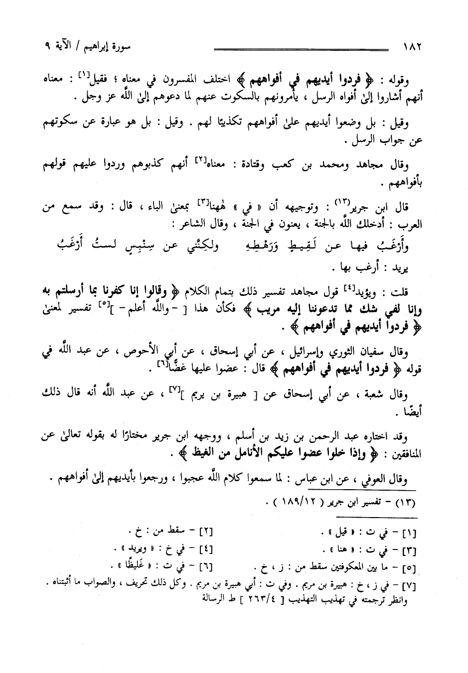 يُرِيد أَرْغَب بِهَا قُلْت وَيُؤَيِّد قَوْل مُجَاهِد تَفْسِير ذَلِكَ بِتَمَامِ الْكَلَام " وَقَالُوا إِنَّا كَفَرْنَا بِمَا أُرْسِلْتُمْ بِهِ وَإِنَّا لَفِي شَكٍّ مِمَّا تَدْعُونَنَا إِلَيْهِ مُرِيبٍ " فَكَانَ هَذَا وَاَللَّه أَعْلَم تَفْسِيرًا لِمَعْنَى " فَرَدُّوا أَيْدِيَهُمْ فِي أَفْوَاهِهِمْ " وَقَالَ سُفْيَان الثَّوْرِيّ وَإِسْرَائِيل عَنْ أَبِي إِسْحَاق عَنْ أَبِي الْأَحْوَص عَنْ عَبْد اللَّه فِي قَوْله" فَرَدُّوا أَيْدِيَهُمْ فِي أَفْوَاههمْ " قَالَ عَضُّوا عَلَيْهَا غَيْظًا وَقَالَ شُعْبَة عَنْ أَبِي إِسْحَاق أَبِي هُبَيْرَة اِبْن مَرْيَم عَنْ عَبْد اللَّه أَنَّهُ قَالَ ذَلِكَ أَيْضًا .