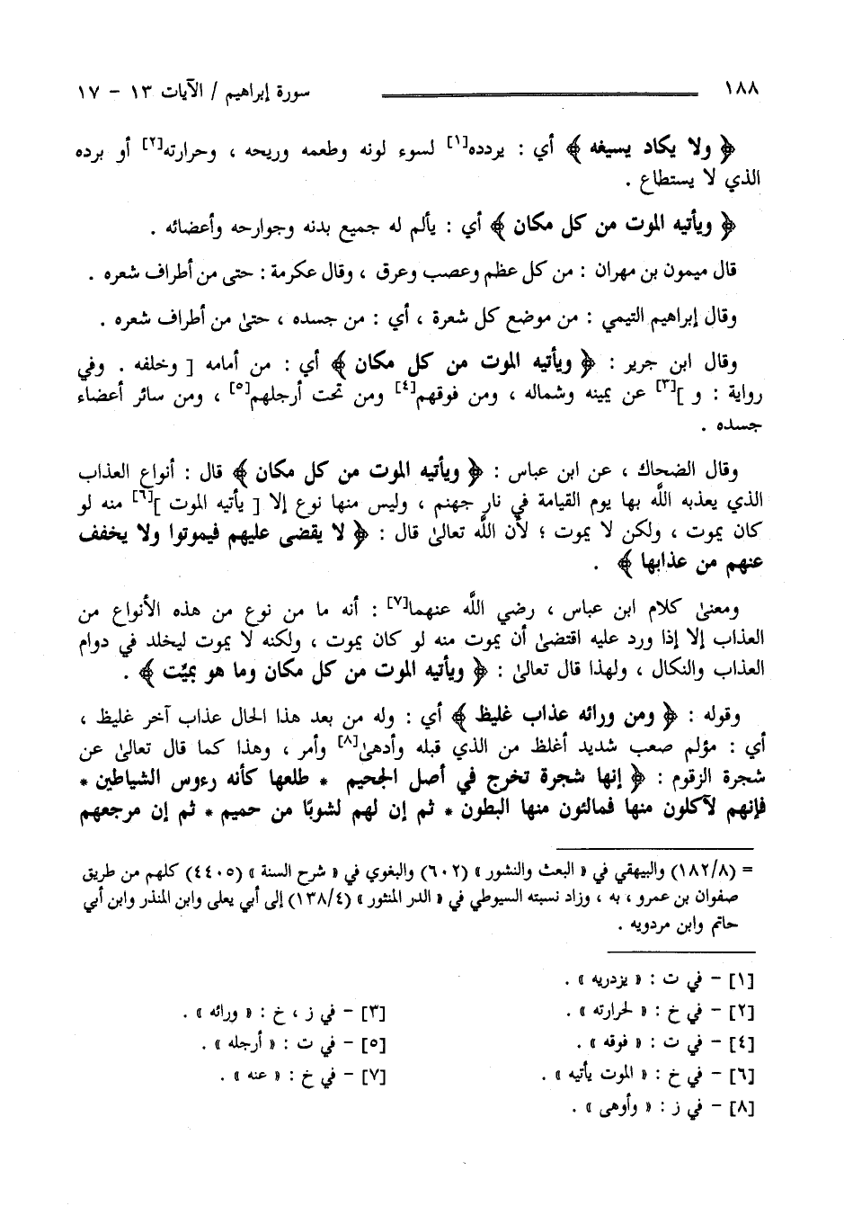 وَلَا يَكَادُ يُسِيغُهُ " أَيْ يَزْدَرِيه لِسُوءِ طَعْمِهِ وَلَوْنِهِ وَرِيحِهِ وَحَرَارَته أَوْ بَرْدِهِ الَّذِي لَا يُسْتَطَاعُ " وَيَأْتِيه الْمَوْت مِنْ كُلِّ مَكَانٍ " أَيْ يَأْلَمُ لَهُ جَمِيع بَدَنِهِ وَجَوَارِحِهِ وَأَعْضَائِهِ قَالَ عَمْرو بْن مَيْمُون بْن مِهْرَان مِنْ كُلّ عَظْم وَعَصَب وَعِرْق وَقَالَ عِكْرِمَة حَتَّى مِنْ أَطْرَاف شَعْره وَقَالَ إِبْرَاهِيم التَّيْمِيّ مِنْ مَوْضِع كُلّ شَعْرَة أَيْ مِنْ جَسَده حَتَّى مِنْ أَطْرَاف شَعْره وَقَالَ اِبْن جَرِير " وَيَأْتِيه الْمَوْت مِنْ كُلّ مَكَان " أَيْ مِنْ أَمَامه وَخَلْفه وَفِي رِوَايَة وَعَنْ يَمِينه وَشِمَاله وَمِنْ فَوْقه وَمِنْ تَحْت أَرْجُله وَمِنْ سَائِر أَعْضَاء جَسَده وَقَالَ الضَّحَّاك عَنْ اِبْن عَبَّاس " وَيَأْتِيه الْمَوْتُ مِنْ كُلِّ مَكَانٍ " قَالَ أَنْوَاع الْعَذَاب الَّذِي يُعَذِّبُهُ اللَّهُ بِهَا يَوْمَ الْقِيَامَةِ فِي نَارِ جَهَنَّمَ لَيْسَ مِنْهَا نَوْعٌ إِلَّا يَأْتِيه الْمَوْتُ مِنْهُ لَوْ كَانَ يَمُوتُ وَلَكِنْ لَا يَمُوت لِأَنَّ اللَّه تَعَالَى قَالَ" لَا يُقْضَى عَلَيْهِمْ فَيَمُوتُوا وَلَا يُخَفَّفُ عَنْهُمْ مِنْ عَذَابِهَا " وَمَعْنَى كَلَام اِبْن عَبَّاس رَضِيَ اللَّه عَنْهُ : أَنَّهُ مَا مِنْ نَوْع مِنْ هَذِهِ الْأَنْوَاع مِنْ الْعَذَاب إِلَّا إِذَا وَرَدَ عَلَيْهِ اِقْتَضَى أَنْ يَمُوت مِنْهُ لَوْ كَانَ يَمُوت وَلَكِنَّهُ لَا يَمُوت لِيَخْلُدَ فِي دَوَام الْعَذَاب وَالنَّكَال وَلِهَذَا قَالَ تَعَالَى " وَيَأْتِيه الْمَوْتُ مِنْ كُلِّ مَكَانٍ وَمَا هُوَ بِمَيِّتٍ " وَقَوْله " وَمِنْ وَرَائِهِ عَذَابٌ غَلِيظٌ" أَيْ وَلَهُ مِنْ بَعْد هَذِهِ الْحَال عَذَاب آخَر غَلِيظ أَيْ مُؤْلِم صَعْب شَدِيد أَغْلَظُ مِنْ الَّذِي قَبْله وَأَدْهَى وَأَمَرُّ وَهَذَا كَمَا قَالَ تَعَالَى عَنْ شَجَرَة الزَّقُّوم " إِنَّهَا شَجَرَة تَخْرُج فِي أَصْل الْجَحِيم طَلْعُهَا كَأَنَّهُ رُءُوس الشَّيَاطِين فَإِنَّهُمْ لَآكِلُونَ مِنْهَا فَمَالِئُونَ مِنْهَا الْبُطُون ثُمَّ إِنَّ لَهُمْ عَلَيْهَا لَشَوْبًا مِنْ حَمِيمٍ ثُمَّ إِنَّ مَرْجِعَهُمْ