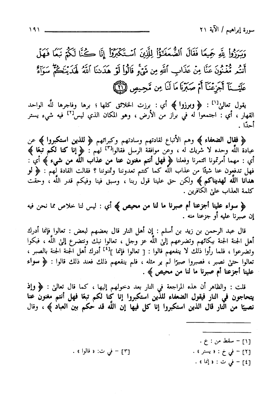 قَالَ عَبْد الرَّحْمَن بْن زَيْد بْن أَسْلَمَ : إِنَّ أَهْل النَّار قَالَ بَعْضهمْ لِبَعْضٍ تَعَالَوْا فَإِنَّمَا أَدْرَكَ أَهْل الْجَنَّة الْجَنَّة بِبُكَائِهِمْ وَتَضَرُّعِهِمْ إِلَى اللَّه عَزَّ وَجَلَّ تَعَالَوْا نَبْكِ وَنَتَضَرَّع إِلَى اللَّه فَبَكَوْا وَتَضَرَّعُوا فَلَمَّا رَأَوْا أَنَّهُ لَا يَنْفَعهُمْ قَالُوا إِنَّمَا أَدْرَكَ أَهْل الْجَنَّة الْجَنَّة بِالصَّبْرِ تَعَالَوْا حَتَّى نَصْبِر فَصَبَرُوا صَبْرًا لَمْ يُرَ مِثْله فَلَمْ يَنْفَعهُمْ ذَلِكَ فَعِنْد ذَلِكَ قَالُوا " سَوَاء عَلَيْنَا أَجَزِعْنَا أَمْ صَبَرْنَا " الْآيَة قُلْت وَالظَّاهِر أَنَّ هَذِهِ الْمُرَاجَعَة فِي النَّار بَعْد دُخُولهمْ إِلَيْهَا كَمَا قَالَ تَعَالَى " وَإِذْ يَتَحَاجُّونَ فِي النَّار فَيَقُول الضُّعَفَاء لِلَّذِينَ اِسْتَكْبَرُوا إِنَّا كُنَّا لَكُمْ تَبَعًا فَهَلْ أَنْتُمْ مُغْنُونَ عَنَّا نَصِيبًا مِنْ النَّار قَالَ الَّذِينَ اِسْتَكْبَرُوا إِنَّا كُلٌّ فِيهَا إِنَّ اللَّه قَدْ حَكَمَ بَيْن الْعِبَاد " وَقَالَ