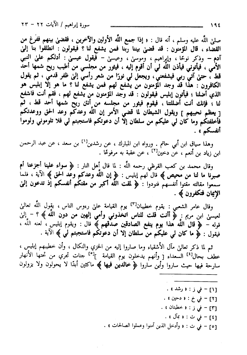 الْكَافِرُونَ هَذَا قَدْ وَجَدَ الْمُؤْمِنُونَ مَنْ يَشْفَع لَهُمْ فَمَنْ يَشْفَع لَنَا ؟ مَا هُوَ إِلَّا إِبْلِيس هُوَ الَّذِي أَضَلَّنَا فَيَأْتُونَ إِبْلِيس فَيَقُولُونَ قَدْ وَجَدَ الْمُؤْمِنُونَ مَنْ يَشْفَع لَهُمْ فَقُمْ أَنْتَ فَاشْفَعْ لَنَا فَإِنَّك أَنْتَ أَضْلَلْتنَا فَيَقُوم فَيَثُور مِنْ مَجْلِسه مِنْ أَنْتَنِ رِيح شَمَّهَا أَحَد قَطُّ ثُمَّ يَعْظُم نَحِيبُهُمْ " وَقَالَ الشَّيْطَان لَمَّا قُضِيَ الْأَمْر إِنَّ اللَّه وَعَدَكُمْ وَعْدَ الْحَقّ وَوَعَدْتُكُمْ فَأَخْلَفْتُكُمْ وَمَا كَانَ لِيَ عَلَيْكُمْ مِنْ سُلْطَان إِلَّا أَنْ دَعَوْتُكُمْ فَاسْتَجَبْتُمْ لِي فَلَا تَلُومُونِي وَلُومُوا أَنْفُسكُمْ " وَهَذَا سِيَاق اِبْن أَبِي حَاتِم وَرَوَاهُ الْمُبَارَك عَنْ رِشْدِين بْن سَعْد عَنْ عَبْد الرَّحْمَن بْن زِيَاد بْن نُعَيْم عَنْ دُخَيْن عَنْ عُقْبَة بِهِ مَرْفُوعًا وَقَالَ مُحَمَّد بْن كَعْب الْقُرَظِيّ رَحِمَهُ اللَّه لَمَّا قَالَ أَهْل النَّار " سَوَاء عَلَيْنَا أَجَزِعْنَا أَمْ صَبَرْنَا مَا لَنَا مِنْ مَحِيص " قَالَ لَهُمْ إِبْلِيس " إِنَّ اللَّه وَعَدَكُمْ وَعْد الْحَقّ " الْآيَة فَلَمَّا سَمِعُوا مَقَالَته مَقَتُوا أَنْفُسهمْ فَنُودُوا " لَمَقْتُ اللَّهِ أَكْبَرُ مِنْ مَقْتِكُمْ أَنْفُسَكُمْ إِذْ تُدْعَوْنَ إِلَى الْإِيمَانِ فَتَكْفُرُونَ " وَقَالَ عَامِر الشَّعْبِيّ : يَقُوم خَطِيبَانِ يَوْم الْقِيَامَة عَلَى رُءُوس النَّاس يَقُول اللَّه تَعَالَى لِعِيسَى اِبْن مَرْيَم " أَأَنْت قُلْت لِلنَّاسِ اِتَّخِذُونِي وَأُمِّيَ إِلَهَيْنِ مِنْ دُونِ اللَّهِ " - إِلَى قَوْله - " قَالَ اللَّه هَذَا يَوْم يَنْفَع الصَّادِقِينَ صِدْقهمْ " قَالَ وَيَقُوم إِبْلِيس لَعَنَهُ اللَّه فَيَقُول " مَا كَانَ لِيَ عَلَيْكُمْ مِنْ سُلْطَان إِلَّا أَنْ دَعَوْتُكُمْ فَاسْتَجَبْتُمْ لِي " الْآيَة .