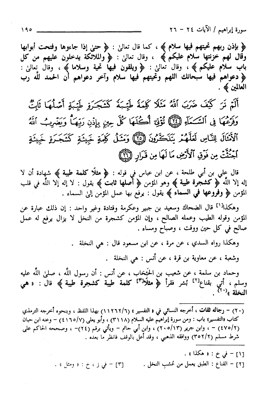 قَالَ عَلِيّ بْن أَبِي طَلْحَة عَنْ اِبْن عَبَّاس فِي قَوْله " مَثَلًا كَلِمَة طَيِّبَة " شَهَادَة أَنْ لَا إِلَه إِلَّا اللَّه " كَشَجَرَةٍ طَيِّبَة" وَهُوَ الْمُؤْمِن " أَصْلُهَا ثَابِت " يَقُول لَا إِلَه إِلَّا اللَّه فِي قَلْب الْمُؤْمِن " وَفَرْعهَا فِي السَّمَاء " يَقُول يُرْفَع بِهَا عَمَل الْمُؤْمِن إِلَى السَّمَاء وَهَكَذَا قَالَ الضَّحَّاك وَسَعِيد بْن جُبَيْر وَعِكْرِمَة وَمُجَاهِد وَغَيْر وَاحِد إِنَّ ذَلِكَ عِبَارَة عَنْ عَمَل الْمُؤْمِن وَقَوْله الطَّيِّب وَعَمَله الصَّالِح وَإِنَّ الْمُؤْمِن كَشَجَرَةٍ مِنْ النَّخْل لَا يَزَال يُرْفَع لَهُ عَمَل صَالِح فِي كُلّ حِين وَوَقْت وَصَبَاح وَمَسَاء وَهَكَذَا رَوَاهُ السُّدِّيّ عَنْ مُرَّة عَنْ اِبْن مَسْعُود قَالَ هِيَ النَّخْلَة وَشُعْبَة عَنْ مُعَاوِيَة بْن قُرَّة عَنْ أَنَس هِيَ النَّخْلَة .