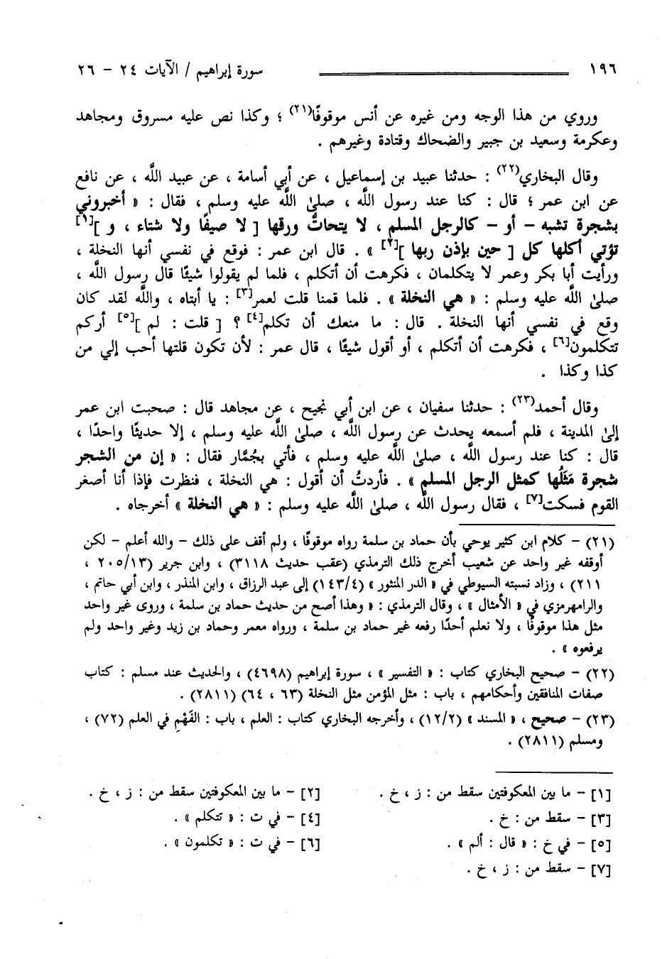 وَرُوِيَ مِنْ هَذَا الْوَجْه وَمِنْ غَيْره عَنْ أَنَس مَوْقُوفًا وَكَذَا نَصَّ عَلَيْهِ مَسْرُوق وَمُجَاهِد وَعِكْرِمَة وَسَعِيد بْن جُبَيْر وَالضَّحَّاك وَقَتَادَة وَغَيْرهمْ وَقَالَ الْبُخَارِيّ : حَدَّثَنَا عُبَيْد بْن إِسْمَاعِيل عَنْ أَبِي أُسَامَة عَنْ عُبَيْد اللَّه عَنْ نَافِع عَنْ اِبْن عُمَر قَالَ : كُنَّا عِنْد رَسُول اللَّه صَلَّى اللَّه عَلَيْهِ وَسَلَّمَ فَقَالَ " أَخْبِرُونِي عَنْ شَجَرَة تُشْبِه - أَوْ - كَالرَّجُلِ الْمُسْلِم لَا يَتَحَاتّ وَرَقهَا صَيْفًا وَلَا شِتَاء وَتُؤْتِي أُكُلَهَا كُلّ حِين بِإِذْنِ رَبّهَا " قَالَ اِبْن عُمَر : فَوَقَعَ فِي نَفْسِي أَنَّهَا النَّخْلَة وَرَأَيْت أَبَا بَكْر وَعُمَر لَا يَتَكَلَّمَانِ فَكَرِهْت أَنْ أَتَكَلَّمَ فَلَمَّا لَمْ يَقُولُوا شَيْئًا قَالَ رَسُول اللَّه صَلَّى اللَّه عَلَيْهِ وَسَلَّمَ " هِيَ النَّخْلَة " فَلَمَّا قُمْنَا قُلْت لِعُمَرَ : يَا أَبَتَاهُ وَاَللَّه لَقَدْ كَانَ وَقَعَ فِي نَفْسِي أَنَّهَا النَّخْلَة قَالَ مَا مَنَعَك أَنْ تَتَكَلَّم ؟ قُلْت لَمْ أَرَكُمْ تَتَكَلَّمُونَ فَكَرِهْت أَنْ أَتَكَلَّم أَوْ أَقُول شَيْئًا قَالَ عُمَر : لَأَنْ تَكُون قُلْتهَا أَحَبُّ إِلَيَّ مِنْ كَذَا وَكَذَا وَقَالَ أَحْمَد : حَدَّثَنَا سُفْيَان عَنْ اِبْن أَبِي نَجِيح عَنْ مُجَاهِد صَحِبْت اِبْن عُمَر إِلَى الْمَدِينَة فَلَمْ أَسْمَعهُ يُحَدِّث عَنْ رَسُول اللَّه صَلَّى اللَّه عَلَيْهِ وَسَلَّمَ إِلَّا حَدِيثًا وَاحِدًا قَالَ : كُنَّا عِنْد رَسُول اللَّه صَلَّى اللَّه عَلَيْهِ وَسَلَّمَ فَأَتَى بِجِمَارٍ فَقَالَ " مِنْ الشَّجَر شَجَرَة مَثَلهَا مَثَل الرَّجُل الْمُسْلِم " فَأَرَدْت أَنْ أَقُول هِيَ النَّخْلَة فَنَظَرْت فَإِذَا أَنَا أَصْغَر الْقَوْم فَقَالَ رَسُول اللَّه صَلَّى اللَّه عَلَيْهِ وَسَلَّمَ " هِيَ النَّخْلَة " أَخْرَجَاهُ