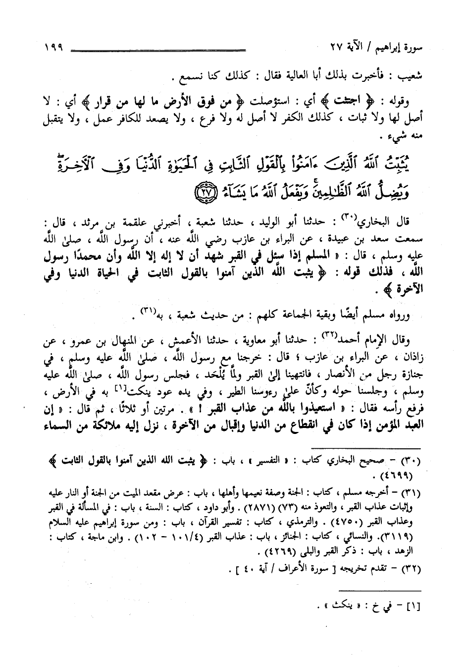" قَالَ الْبُخَارِيّ حَدَّثَنَا اِبْن الْوَلِيد حَدَّثَنَا شُعْبَة أَخْبَرَنِي عَلْقَمَة بْن مَرْثَد قَالَ سَمِعْت سَعْد بْن عُبَيْدَة عَنْ الْبَرَاء بْن عَازِب رَضِيَ اللَّه عَنْهُ أَنَّ رَسُول اللَّه صَلَّى اللَّه عَلَيْهِ وَسَلَّمَ قَالَ " الْمُسْلِم إِذَا سُئِلَ فِي الْقَبْر شَهِدَ أَنْ لَا إِلَه إِلَّا اللَّه وَأَنَّ مُحَمَّدًا رَسُول اللَّه فَذَلِكَ قَوْله " يُثَبِّتُ اللَّهُ الَّذِينَ آمَنُوا بِالْقَوْلِ الثَّابِتِ فِي الْحَيَاةِ الدُّنْيَا وَفِي الْآخِرَةِ" وَرَوَاهُ مُسْلِم أَيْضًا وَبَقِيَّة الْجَمَاعَة كُلّهمْ مِنْ حَدِيث شُعْبَة بِهِ وَقَالَ الْإِمَام أَحْمَد حَدَّثَنَا أَبُو مُعَاوِيَة حَدَّثَنَا الْأَعْمَش عَنْ الْمِنْهَال بْن عَمْرو عَنْ زَاذَان عَنْ الْبَرَاء بْن عَازِب قَالَ خَرَجْنَا مَعَ رَسُول اللَّه صَلَّى اللَّه عَلَيْهِ وَسَلَّمَ فِي جِنَازَة رَجُل مِنْ الْأَنْصَار فَانْتَهَيْنَا إِلَى الْقَبْر وَلَمَّا يُلْحَد فَجَلَسَ رَسُول اللَّه صَلَّى اللَّه عَلَيْهِ وَسَلَّمَ وَجَلَسْنَا حَوْله كَأَنَّ عَلَى رُءُوسنَا الطَّيْر وَفِي يَده عُود يُنَكِّت بِهِ فِي الْأَرْض فَرَفَعَ رَأْسه فَقَالَ" اِسْتَعِيذُوا بِاَللَّهِ مِنْ عَذَابِ الْقَبْرِ " مَرَّتَيْنِ أَوْ ثَلَاثًا ثُمَّ قَالَ " إِنَّ الْعَبْد الْمُؤْمِنَ إِذَا كَانَ فِي اِنْقِطَاع مِنْ الدُّنْيَا وَإِقْبَال مِنْ الْآخِرَة نَزَلَ إِلَيْهِ مَلَائِكَة مِنْ السَّمَاء