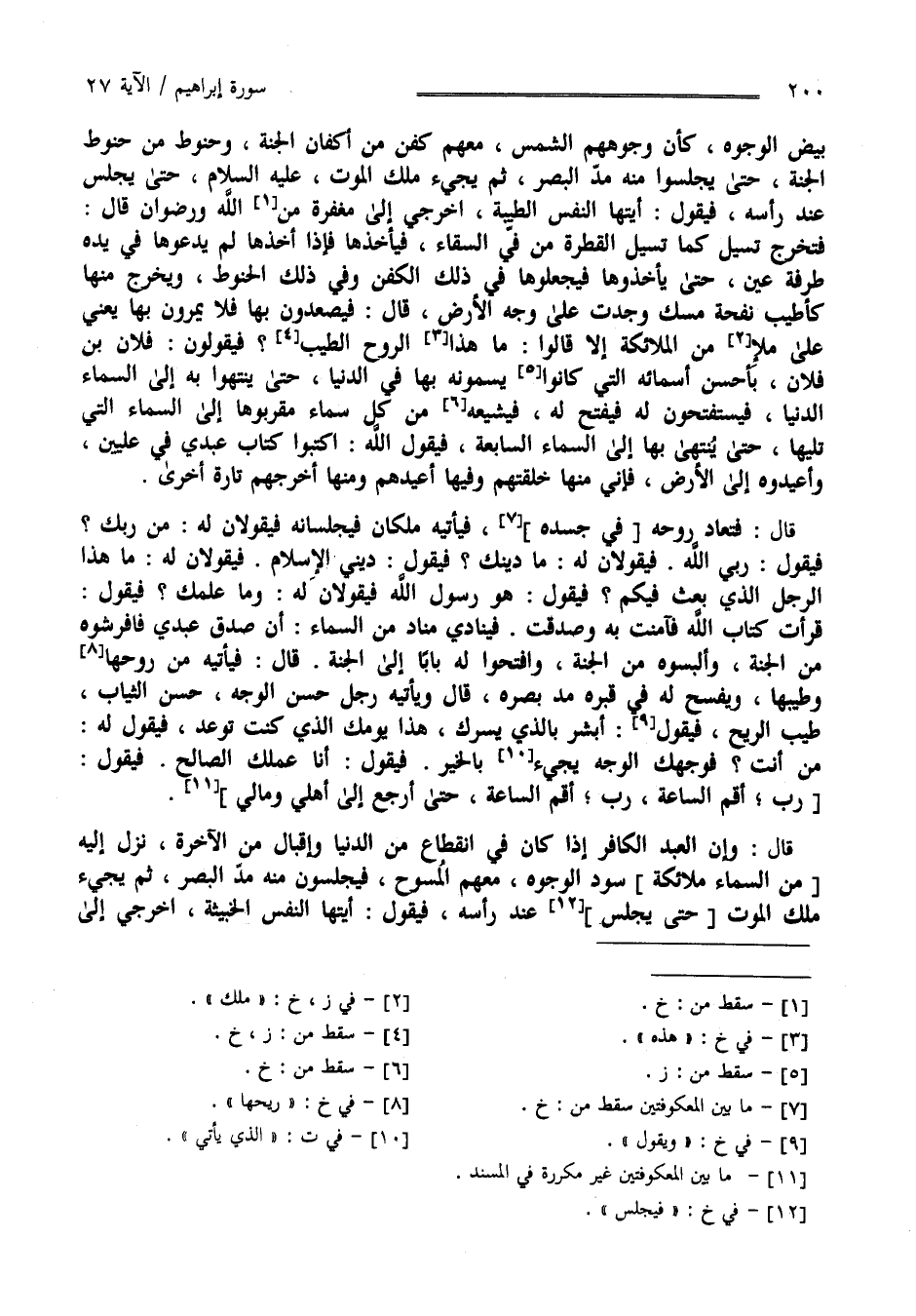 بِيضُ الْوُجُوهِ كَأَنَّ وُجُوههمْ الشَّمْس مَعَهُمْ كَفَن مِنْ أَكْفَان الْجَنَّة وَحَنُوط مِنْ حَنُوط الْجَنَّة حَتَّى يَجْلِسُوا مِنْهُ مَدّ الْبَصَر ثُمَّ يَجِيء مَلَكُ الْمَوْت حَتَّى يَجْلِس عِنْد رَأْسِهِ فَيَقُول أَيَّتهَا النَّفْس الطَّيِّبَة اُخْرُجِي إِلَى مَغْفِرَة مِنْ اللَّه وَرِضْوَان - قَالَ - فَتَخْرُج تَسِيل كَمَا تَسِيل الْقَطْرَة مِنْ فِي السِّقَاء فَيَأْخُذهَا فَإِذَا أَخَذَهَا لَمْ يَدَعُوهَا فِي يَده طَرْفَة عَيْن حَتَّى يَأْخُذُوهَا فَيَجْعَلُوهَا فِي ذَلِكَ الْكَفَن وَفِي ذَلِكَ الْحَنُوط وَيَخْرُج مِنْهَا كَأَطْيَب نَفْحَة مِسْك وُجِدَتْ عَلَى وَجْه الْأَرْض فَيَصْعَدُونَ بِهَا فَلَا يَمُرُّونَ بِهَا يَعْنِي عَلَى مَلَإٍ مِنْ الْمَلَائِكَة إِلَّا قَالُوا مَا هَذِهِ الرُّوح الطَّيِّبَة ؟ فَيَقُولُونَ فُلَان اِبْن فُلَان بِأَحْسَن أَسْمَائِهِ الَّتِي كَانُوا يُسَمُّونَهُ بِهَا فِي الدُّنْيَا حَتَّى يَنْتَهُوا بِهِ إِلَى السَّمَاء الدُّنْيَا فَيَسْتَفْتِحُونَ لَهُ فَيُفْتَح لَهُ فَيُشَيِّعهُ مِنْ كُلّ سَمَاء مُقَرَّبُوهَا إِلَى السَّمَاء الَّتِي تَلِيهَا حَتَّى يُنْتَهَى بِهَا إِلَى السَّمَاء السَّابِعَة فَيَقُول اللَّه اُكْتُبُوا كِتَاب عَبْدِي فِي عِلِّيِّينَ وَأَعِيدُوهُ إِلَى الْأَرْض فَإِنِّي مِنْهَا خَلَقْتهُمْ وَفِيهَا أُعِيدهُمْ وَمِنْهَا أُخْرِجُهُمْ تَارَة أُخْرَى قَالَ فَتُعَاد رُوحه فِي جَسَده فَيَأْتِيه مَلَكَانِ فَيُجْلِسَانِهِ فَيَقُولَانِ لَهُ مَنْ رَبُّك ؟ فَيَقُول رَبِّي اللَّه فَيَقُولَانِ لَهُ مَا دِينُك ؟ فَيَقُول دِينِي الْإِسْلَام فَيَقُولَانِ لَهُ مَا هَذَا الرَّجُل الَّذِي بُعِثَ فِيكُمْ ؟ فَيَقُول هُوَ رَسُول اللَّه فَيَقُولَانِ لَهُ وَمَا عَلَّمَك ؟ فَيَقُول قَرَأْت كِتَاب اللَّه فَآمَنْت بِهِ وَصَدَّقْت فَيُنَادِي مُنَادٍ مِنْ السَّمَاء أَنْ صَدَقَ عَبْدِي فَأَفْرِشُوهُ مِنْ الْجَنَّة وَأَلْبِسُوهُ مِنْ الْجَنَّة وَافْتَحُوا لَهُ بَابًا إِلَى الْجَنَّة - قَالَ -