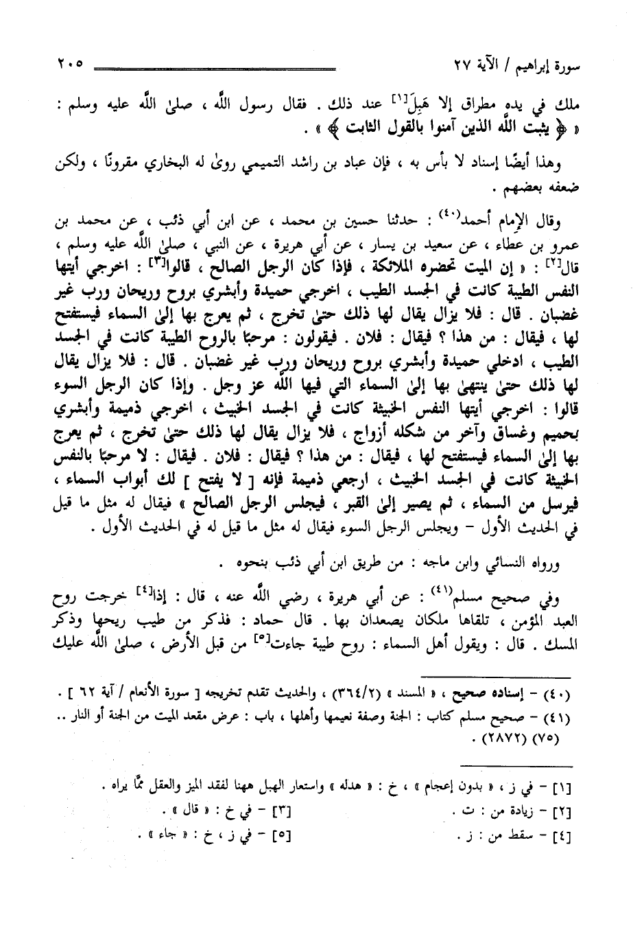 مَلَك فِي يَده مِطْرَاق إِلَّا هُيِّلَ عِنْد ذَلِكَ فَقَالَ رَسُول اللَّه صَلَّى اللَّه عَلَيْهِ وَسَلَّمَ " يُثَبِّتُ اللَّهُ الَّذِينَ آمَنُوا بِالْقَوْلِ الثَّابِتِ " وَهَذَا أَيْضًا إِسْنَاد لَا بَأْس بِهِ فَإِنَّ عَبَّاد بْن رَاشِد التَّمِيمِيّ رَوَى لَهُ الْبُخَارِيّ مَقْرُونًا وَلَكِنْ ضَعَّفَهُ بَعْضهمْ وَقَالَ الْإِمَام أَحْمَد حَدَّثَنَا حُسَيْن بْن مُحَمَّد عَنْ اِبْن أَبِي ذِئْب عَنْ مُحَمَّد بْن عَمْرو بْن عَطَاء عَنْ سَعِيد بْن يَسَار عَنْ أَبِي هُرَيْرَة عَنْ النَّبِيّ صَلَّى اللَّه عَلَيْهِ وَسَلَّمَ قَالَ " إِنَّ الْمَيِّت تَحْضُرُهُ الْمَلَائِكَة فَإِذَا كَانَ الرَّجُل الصَّالِح قَالُوا اُخْرُجِي أَيَّتُهَا النَّفْسُ الطَّيِّبَة كَانَتْ فِي الْجَسَد الطَّيِّب اُخْرُجِي حَمِيدَة وَأَبْشِرِي بِرَوْحٍ وَرَيْحَانٍ وَرَبٍّ غَيْر غَضْبَان قَالَ فَلَا يَزَال يُقَال لَهَا ذَلِكَ حَتَّى تَخْرُج ثُمَّ يُعْرَج بِهَا إِلَى السَّمَاء فَيُسْتَفْتَح لَهَا فَيُقَال مَنْ هَذَا ؟ فَيُقَال فُلَان فَيَقُولُونَ مَرْحَبًا بِالرُّوحِ الطَّيِّبَة كَانَتْ فِي الْجَسَد الطَّيِّب اُدْخُلِي حَمِيدَة وَأَبْشِرِي بِرَوْحٍ وَرَيْحَانٍ وَرَبٍّ غَيْر غَضْبَان - قَالَ - فَلَا يَزَال يُقَال لَهَا حَتَّى يُنْتَهَى بِهَا إِلَى السَّمَاء الَّتِي فِيهَا اللَّه عَزَّ وَجَلَّ وَإِذَا كَانَ الرَّجُل السُّوء قَالُوا اُخْرُجِي أَيَّتهَا النَّفْس الْخَبِيثَة كَانَتْ فِي الْجَسَد الْخَبِيث اُخْرُجِي ذَمِيمَة وَأَبْشِرِي بِحَمِيمٍ وَغَسَّاق وَآخَر مِنْ شَكْله أَزْوَاج فَلَا يَزَال يُقَال لَهَا ذَلِكَ حَتَّى تَخْرُج ثُمَّ يُعْرَج بِهَا إِلَى السَّمَاء فَيُسْتَفْتَح لَهَا فَيُقَال مَنْ هَذَا ؟ فَيُقَال فُلَان فَيُقَال