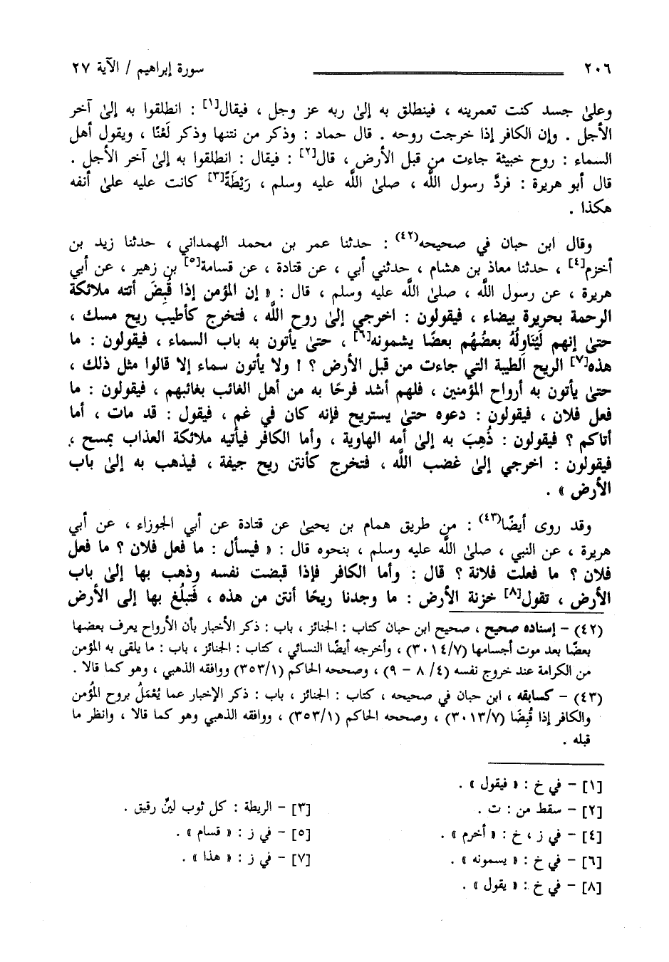 وَعَلَى جَسَد كُنْت تَعْمُرِينَهُ فَيَنْطَلِق بِهِ إِلَى رَبّه عَزَّ وَجَلَّ فَيُقَال اِنْطَلَقُوا بِهِ إِلَى آخِر الْأَجَل وَإِنَّ الْكَافِر إِذَا خَرَجَتْ رُوحه - قَالَ حَمَّاد - وَذَكَرَ مِنْ نَتِنهَا وَذَكَرَ مَقْتًا وَيَقُول أَهْل السَّمَاء رُوح خَبِيثَة جَاءَتْ مِنْ قِبَلِ الْأَرْض فَيُقَال اِنْطَلَقُوا بِهِ إِلَى آخِر الْأَجَل - قَالَ أَبُو هُرَيْرَة - فَرَدَّ رَسُول اللَّه صَلَّى اللَّه عَلَيْهِ وَسَلَّمَ رَيْطَة كَانَتْ عَلَيْهِ عَلَى أَنْفِهِ هَكَذَا وَقَالَ اِبْن حِبَّان فِي صَحِيحه حَدَّثَنَا عُمَر بْن مُحَمَّد الْهَمْدَانِيّ حَدَّثَنَا زَيْد بْن أَحْزَم حَدَّثَنَا مُعَاذ بْن هِشَام حَدَّثَنِي أَبِي عَنْ قَتَادَة عَنْ قَسَّام بْن زُهَيْر عَنْ أَبِي هُرَيْرَة عَنْ رَسُول اللَّه صَلَّى اللَّه عَلَيْهِ وَسَلَّمَ قَالَ " إِنَّ الْمُؤْمِن إِذَا قُبِضَ أَتَتْهُ مَلَائِكَة الرَّحْمَة بِحَرِيرَةٍ بَيْضَاء فَيَقُولُونَ اُخْرُجِي إِلَى رُوح اللَّه فَتَخْرُج كَأَطْيَب رِيح مِسْك حَتَّى إِنَّهُ لَيُنَاوِلُهُ بَعْضهمْ بَعْضًا يَشُمُّونَهُ حَتَّى يَأْتُوا بِهِ بَاب السَّمَاء فَيَقُولُونَ مَا هَذِهِ الرِّيح الطَّيِّبَة الَّتِي جَاءَتْ مِنْ قِبَلِ الْأَرْض وَلَا يَأْتُونَ سَمَاء إِلَّا قَالُوا مِثْل ذَلِكَ حَتَّى يَأْتُوا بِهِ أَرْوَاح الْمُؤْمِنِينَ فَلَهُمْ أَشَدُّ فَرَحًا بِهِ مِنْ أَهْل الْغَائِب بِغَائِبِهِمْ فَيَقُولُونَ مَا فَعَلَ فُلَان فَيَقُولُونَ دَعُوهُ حَتَّى يَسْتَرِيح فَإِنَّهُ كَانَ فِي غَمٍّ فَيَقُول قَدْ مَاتَ أَمَا أَتَاكُمْ فَيَقُولُونَ ذُهِبَ بِهِ إِلَى أُمّه الْهَاوِيَة وَأَمَّا الْكَافِر فَيَأْتِيه مَلَائِكَة الْعَذَاب بِمَسْحٍ فَيَقُولُونَ اُخْرُجِي إِلَى غَضَب اللَّه فَتَخْرُج كَأَنْتَن رِيح جِيفَة فَيُذْهَب بِهِ إِلَى بَاب الْأَرْض " .