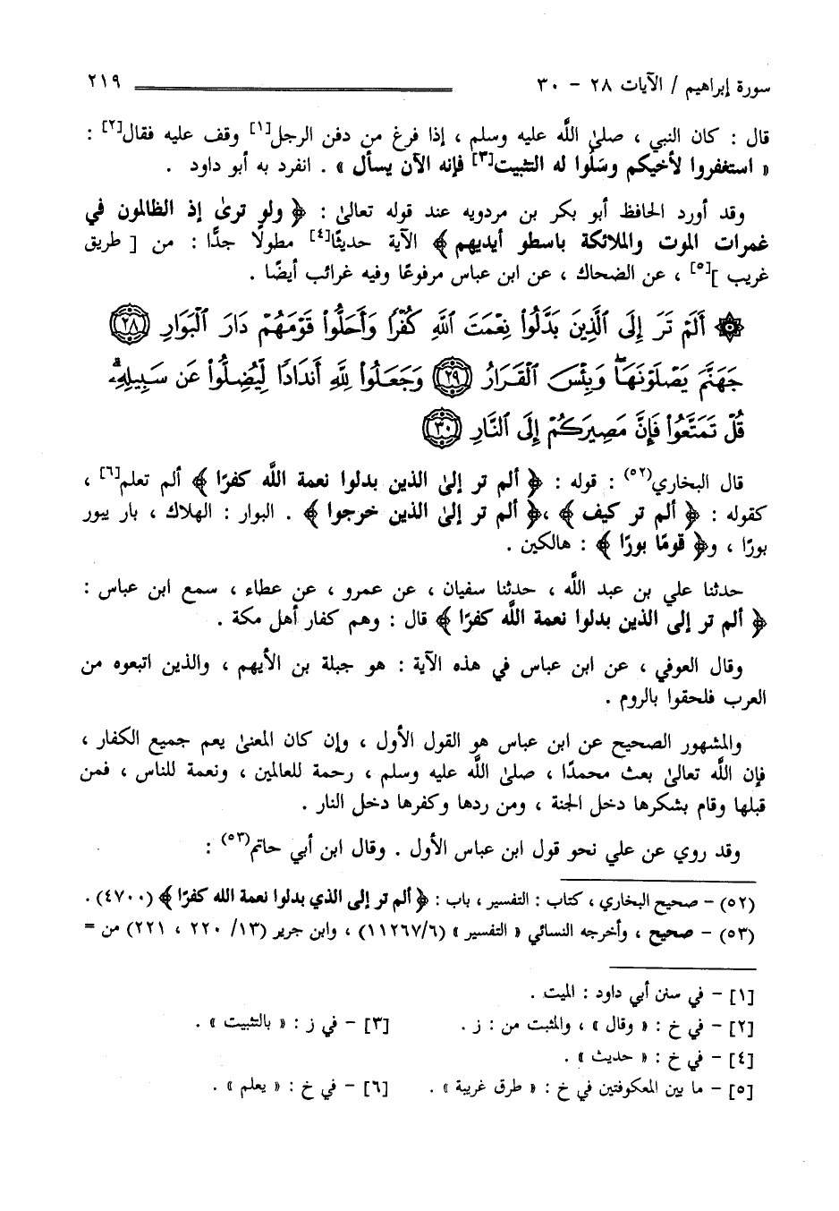 قَالَ الْبُخَارِيّ قَوْله " أَلَمْ تَرَ إِلَى الَّذِينَ بَدَّلُوا نِعْمَة اللَّه كُفْرًا " أَلَمْ تَعْلَم كَقَوْلِهِ " أَلَمْ تَرَ كَيْف " " أَلَمْ تَرَ إِلَى الَّذِينَ خَرَجُوا" الْبَوَار الْهَلَاك بَارَ يَبُور بَوْرًا " وَقَوْمًا بُورًا " هَالِكِينَ حَدَّثَنَا عَلِيّ بْن عَبْد اللَّه حَدَّثَنَا سُفْيَان عَنْ عَمْرو عَنْ عَطَاء سَمِعَ اِبْن عَبَّاس " أَلَمْ تَرَ إِلَى الَّذِينَ بَدَّلُوا نِعْمَةَ اللَّه كُفْرًا " قَالَ هُمْ كُفَّار أَهْل مَكَّة وَقَالَ الْعَوْفِيّ عَنْ اِبْن عَبَّاس فِي هَذِهِ الْآيَة هُوَ جَبَلَة بْن الْأَبْهَم وَاَلَّذِينَ اِتَّبَعُوهُ مِنْ الْعَرَب فَلَحِقُوا بِالرُّومِ وَالْمَشْهُور الصَّحِيح عَنْ اِبْن عَبَّاس هُوَ الْقَوْل الْأَوَّل وَإِنْ كَانَ الْمَعْنَى يَعُمُّ جَمِيع الْكُفَّار فَإِنَّ اللَّه تَعَالَى بَعَثَ مُحَمَّدًا صَلَّى اللَّه عَلَيْهِ وَسَلَّمَ رَحْمَة لِلْعَالَمِينَ وَنِعْمَة لِلنَّاسِ فَمِنْ قَبِلَهَا وَقَامَ بِشُكْرِهَا دَخَلَ الْجَنَّة وَمَنْ رَدَّهَا وَكَفَرَهَا دَخَلَ النَّار وَقَدْ رُوِيَ عَنْ عَلِيّ نَحْو قَوْل اِبْن عَبَّاس الْأَوَّل وَقَالَ اِبْن أَبِي حَاتِم