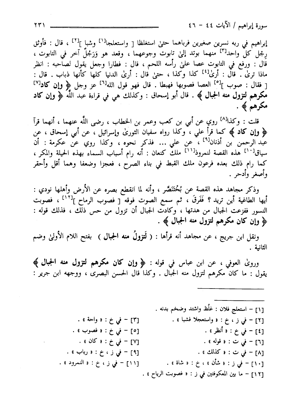 قَالَ فَصَوَّبَ الْعَصَا فَصَوَّبَهَا فَهَبَطَا جَمِيعًا قَالَ فَهُوَ قَوْله عَزَّ وَجَلَّ " وَإِنْ كَادَ مَكْرُهُمْ لِتَزُولَ مِنْهُ الْجِبَالُ" قَالَ أَبُو إِسْحَاق وَكَذَلِكَ هِيَ فِي قِرَاءَة عَبْد اللَّه " وَإِنْ كَادَ مَكْرُهُمْ " قُلْت وَكَذَا رُوِيَ عَنْ أُبَيّ بْن كَعْب وَعُمَر بْن الْخَطَّاب رَضِيَ اللَّه عَنْهُمَا أَنَّهُمَا قَرَآ " وَإِنْ كَادَ " كَمَا قَرَأَ عَلِيّ وَكَذَا رَوَاهُ سُفْيَان الثَّوْرِيّ لِإِسْرَائِيل عَنْ أَبِي إِسْحَاق عَنْ عَبْد الرَّحْمَن بْن رَبَاب عَنْ عَلِيّ فَذَكَرَ نَحْوه وَكَذَا رُوِيَ عَنْ عِكْرِمَة أَنَّ سِيَاق هَذِهِ الْقِصَّة لِنَمْرُوذ مَلِك كَنْعَان أَنَّهُ رَامَ أَسْبَاب السَّمَاء بِهَذِهِ الْحِيلَة وَالْمَكْر كَمَا رَامَ ذَلِكَ بَعْده فِرْعَوْن مَلِك الْقِبْط فِي بِنَاء الصَّرْح فَعَجَزَا وَضَعُفَا وَهُمَا أَقَلُّ وَأَحْقَر وَأَصْغَر وَأَدْحَر ; وَذَكَرَ مُجَاهِد هَذِهِ الْقِصَّة عَنْ بُخْتَنَصَّرَ وَأَنَّهُ لَمَّا اِنْقَطَعَ بَصَره عَنْ الْأَرْض وَأَهْلِهَا نُودِيَ أَيّهَا الطَّاغِيَة أَيْنَ تُرِيد ؟ فَفَرَّقَ ثُمَّ سَمِعَ الصَّوْت فَوْقه فَصَوَّبَ الرِّمَاح فَصَوَّبَتْ النُّسُور فَفَزِعَتْ الْجِبَال مِنْ هَدَّتهَا وَكَادَتْ الْجِبَال أَنْ تَزُول مِنْ حِسّ ذَلِكَ فَذَلِكَ قَوْله " وَإِنْ كَانَ مَكْرُهُمْ لِتَزُولَ مِنْهُ الْجِبَال " وَنَقَلَ اِبْن جُرَيْج عَنْ مُجَاهِد أَنَّهُ قَرَأَهَا" لَتَزُولُ مِنْهُ الْجِبَال " بِفَتْحِ اللَّام الْأُولَى وَضَمِّ الثَّانِيَة وَرَوَى الْعَوْفِيّ عَنْ اِبْن عَبَّاس فِي قَوْله " وَإِنْ كَانَ مَكْرُهُمْ لِتَزُولَ مِنْهُ الْجِبَال " يَقُول مَا كَانَ مَكْرُهُمْ لِتَزُولَ مِنْهُ الْجِبَال وَكَذَا قَالَ الْحَسَن الْبَصْرِيّ وَوَجَّهَهُ اِبْن جَرِير