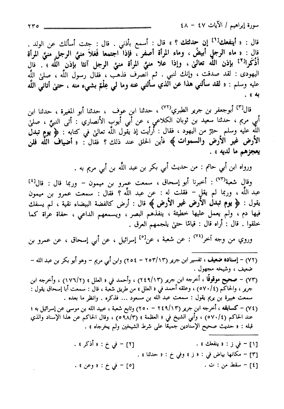 لَقَدْ سَأَلَنِي هَذَا عَنْ الَّذِي سَأَلَنِي عَنْهُ وَمَا لِي عِلْم بِشَيْءٍ مِنْهُ حَتَّى أَتَانِي اللَّه بِهِ " قَالَ أَبُو جَعْفَر بْن جَرِير الطَّبَرِيّ حَدَّثَنَا اِبْن عَوْف حَدَّثَنَا أَبُو الْمُغِيرَة حَدَّثَنَا اِبْن أَبِي مَرْيَم حَدَّثَنَا سَعِيد بْن ثَوْبَان الْكُلَاعِيّ عَنْ أَبِي أَيُّوب الْأَنْصَارِيّ أَنَّ حَبْرًا مِنْ الْيَهُود سَأَلَ النَّبِيّ صَلَّى اللَّه عَلَيْهِ وَسَلَّمَ فَقَالَ أَرَأَيْت إِذْ يَقُول اللَّه تَعَالَى فِي كِتَابه " يَوْم تُبَدَّل الْأَرْض غَيْر الْأَرْض وَالسَّمَاوَات " فَأَيْنَ الْخَلْق عِنْد ذَلِكَ ؟ فَقَالَ " أَضْيَاف اللَّه فَلَنْ يُعْجِزهُمْ مَا لَدَيْهِ " وَرَوَاهُ اِبْن أَبِي حَاتِم مِنْ حَدِيث أَبِي بَكْر بْن عَبْد اللَّه بْن أَبِي مَرْيَم بِهِ وَقَالَ جَعْبَة أَخْبَرَنَا أَبُو إِسْحَاق سَمِعْت عَمْرو بْن مَيْمُون وَرُبَّمَا قَالَ : قَالَ عَبْد اللَّه وَرُبَّمَا لَمْ يَقُلْ فَقُلْت لَهُ عَنْ عَبْد اللَّه فَقَالَ سَمِعْت عَمْرو بْن مَيْمُون يَقُول " يَوْم تُبَدَّل الْأَرْض غَيْر الْأَرْض " قَالَ أَرْض كَالْفِضَّةِ الْبَيْضَاء نَقِيَّة لَمْ يُسْفَك فِيهَا دَم وَلَمْ يُعْمَل عَلَيْهَا خَطِيئَة يَنْفُذهُمْ الْبَصَر وَيُسْمِعهُمْ الدَّاعِي حُفَاة عُرَاة كَمَا خُلِقُوا قَالَ أُرَاهُ قَالَ قِيَامًا حَتَّى يُلْجِمَهُمْ الْعَرَق وَرُوِيَ مِنْ وَجْه آخَر عَنْ شُعْبَة عَنْ إِسْرَائِيل عَنْ أَبِي إِسْحَاق عَنْ عَمْرو بْن