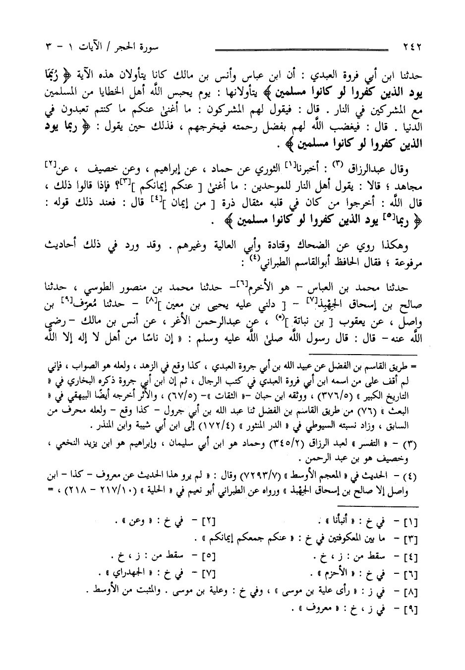 حَدَّثَنَا اِبْن أَبِي فَرْوَة الْعَبْدِيّ أَنَّ اِبْن عَبَّاس وَأَنَس بْن مَالِك كَانَا يَتَأَوَّلَانِ هَذِهِ الْآيَة " رُبَمَا يَوَدّ الَّذِينَ كَفَرُوا لَوْ كَانُوا مُسْلِمِينَ " يَتَأَوَّلَانِهَا يَوْم يَحْبِس اللَّه أَهْل الْخَطَايَا مِنْ الْمُسْلِمِينَ مَعَ الْمُشْرِكِينَ فِي النَّار قَالَ فَيَقُول لَهُمْ الْمُشْرِكُونَ مَا أَغْنَى عَنْكُمْ مَا كُنْتُمْ تَعْبُدُونَ فِي الدُّنْيَا ؟ قَالَ فَيَغْضَب اللَّه لَهُمْ بِفَضْلِ رَحْمَته فَيُخْرِجهُمْ فَذَلِكَ حِين يَقُول " رُبَمَا يَوَدّ الَّذِينَ كَفَرُوا لَوْ كَانُوا مُسْلِمِينَ " وَقَالَ عَبْد الرَّزَّاق أَخْبَرَنَا الثَّوْرِيّ عَنْ حَمَّاد عَنْ إِبْرَاهِيم وَعَنْ خُصَيْف عَنْ مُجَاهِد قَالَا : يَقُول أَهْل النَّار لِلْمُوَحِّدِينَ مَا أَغْنَى عَنْكُمْ إِيمَانكُمْ ؟ فَإِذَا قَالُوا ذَلِكَ قَالَ اللَّه أَخْرِجُوا مَنْ كَانَ فِي قَلْبه مِثْقَال ذَرَّة مِنْ إِيمَان قَالَ فَعِنْد ذَلِكَ قَوْله " رُبَمَا يَوَدّ الَّذِينَ كَفَرُوا لَوْ كَانُوا مُسْلِمِينَ" وَهَكَذَا رُوِيَ عَنْ الضَّحَّاك وَقَتَادَة وَأَبِي الْعَالِيَة وَغَيْرهمْ وَقَدْ وَرَدَ فِي ذَلِكَ أَحَادِيث مَرْفُوعَة فَقَالَ الْحَافِظ أَبُو الْقَاسِم الطَّبَرَانِيّ حَدَّثَنَا مُحَمَّد بْن الْعَبَّاس هُوَ الْأَخْرَم حَدَّثَنَا مُحَمَّد بْن مَنْصُور الطُّوسِيّ حَدَّثَنَا صَالِح بْن إِسْحَاق الْجَهْبَذِيّ وَابْن عُلَيَّة يَحْيَى بْن مُوسَى حَدَّثَنَا مَعْرُوف بْن وَاصِل عَنْ يَعْقُوب بْن نُبَاتَة عَنْ عَبْد الرَّحْمَن الْأَغَرّ عَنْ أَنَس بْن مَالِك رَضِيَ اللَّه عَنْهُ قَالَ : قَالَ رَسُول اللَّه صَلَّى اللَّه عَلَيْهِ وَآله وَسَلَّمَ " إِنَّ نَاسًا مِنْ أَهْل لَا إِلَه إِلَّا اللَّه