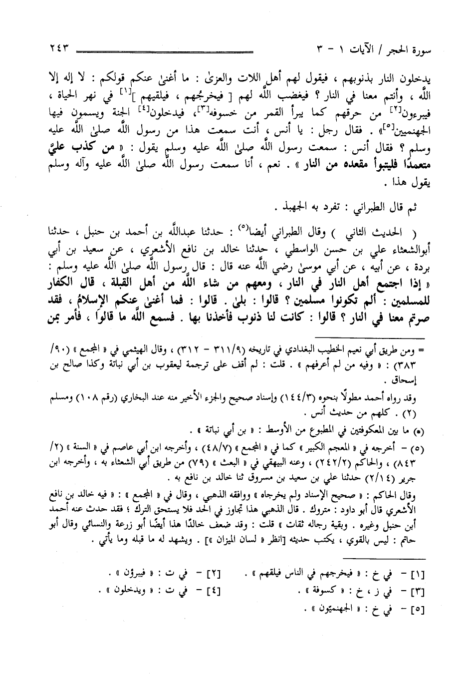 اللَّه عَلَيْهِ وَآله وَسَلَّمَ ؟ فَقَالَ إِنِّي سَمِعْت رَسُول اللَّه صَلَّى اللَّه عَلَيْهِ وَآله وَسَلَّمَ يَقُول " مَنْ كَذَبَ عَلَيَّ مُتَعَمِّدًا فَلْيَتَبَوَّأْ مَقْعَده مِنْ النَّار " نَعَمْ أَنَا سَمِعْت رَسُول اللَّه صَلَّى اللَّه عَلَيْهِ وَعَلَى آله وَسَلَّمَ يَقُول هَذَا ثُمَّ قَالَ الطَّبَرَانِيّ تَفَرَّدَ بِهِ الْجَهْبَذ " الْحَدِيث الثَّانِي " قَالَ الطَّبَرَانِيّ أَيْضًا حَدَّثَنَا عَبْد اللَّه بْن أَحْمَد بْن حَنْبَل حَدَّثَنَا أَبُو الشَّعْثَاء عَلِيّ بْن حَسَن الْوَاسِطِيّ حَدَّثَنَا خَالِد بْن نَافِع الْأَشْعَرِيّ عَنْ سَعِيد بْن أَبِي بُرْدَة عَنْ أَبِيهِ عَنْ أَبِي مُوسَى رَضِيَ اللَّه عَنْهُ قَالَ : قَالَ رَسُول اللَّه صَلَّى اللَّه عَلَيْهِ وَسَلَّمَ " إِذَا اِجْتَمَعَ أَهْل النَّار فِي النَّار وَمَعَهُمْ مَنْ شَاءَ اللَّه مِنْ أَهْل الْقِبْلَة قَالَ الْكُفَّار لِلْمُسْلِمِينَ أَلَمْ تَكُونُوا مُسْلِمِينَ ؟ قَالُوا بَلَى قَالُوا فَمَا أَغْنَى عَنْكُمْ الْإِسْلَام وَقَدْ صِرْتُمْ مَعَنَا فِي النَّار ؟ قَالُوا كَانَتْ لَنَا ذُنُوب فَأَخَذْنَا بِهَا فَسَمِعَ اللَّه مَا قَالُوا فَأَمَرَ بِمَنْ